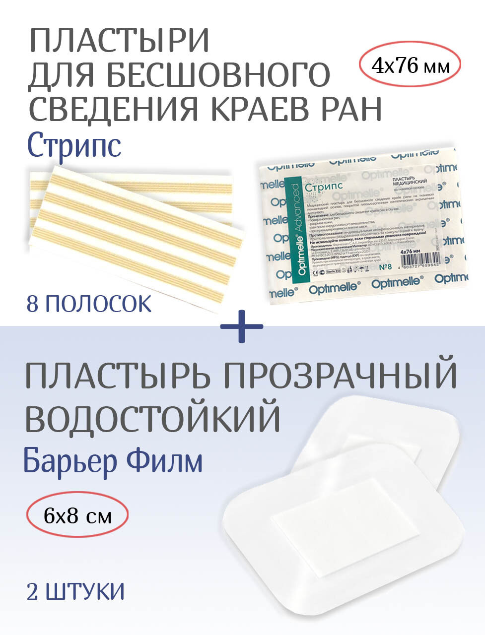 Купить Набор: Пластырь Стрипс 4х76мм №8 + Повязка водостойкая Барьер Филм 6х8см 2шт