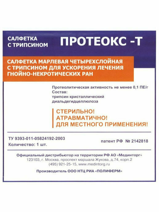 Салфетка Протеокс-Т с трипсином 10х10 см, 5 шт/уп./ Ранозаживляющая салфетка интересное:
