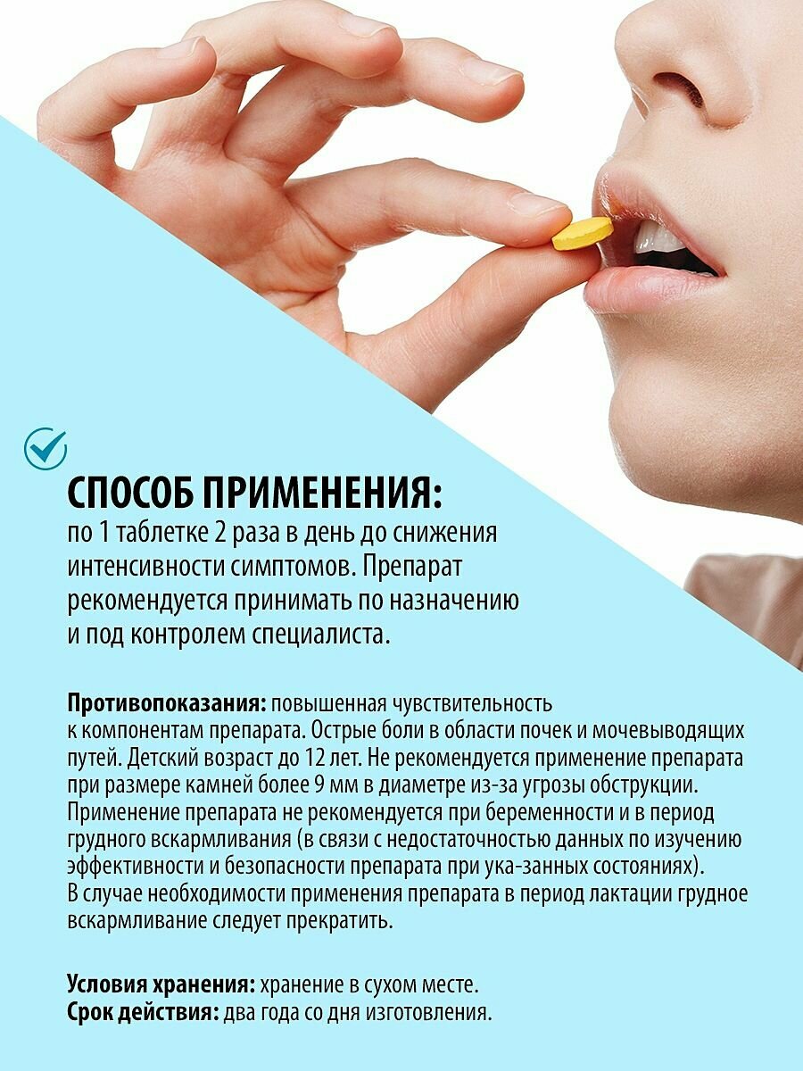 | Способ применения и дозы | затем: для взрослых и детей старше 14 лет - по 1 таблетке, для детей 6–14 лет - по 1/2 таблетки, для детей 2–6 лет - по 1/4 таблетки - 2 раза в сутки, до выхода камней. Для профилактики и предотвращения образования камней в почках: для взрослых и детей старше 14 лет - по 1 таблетке |