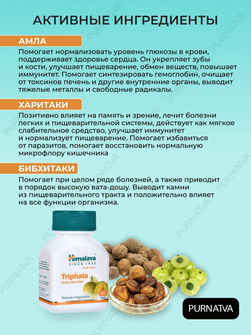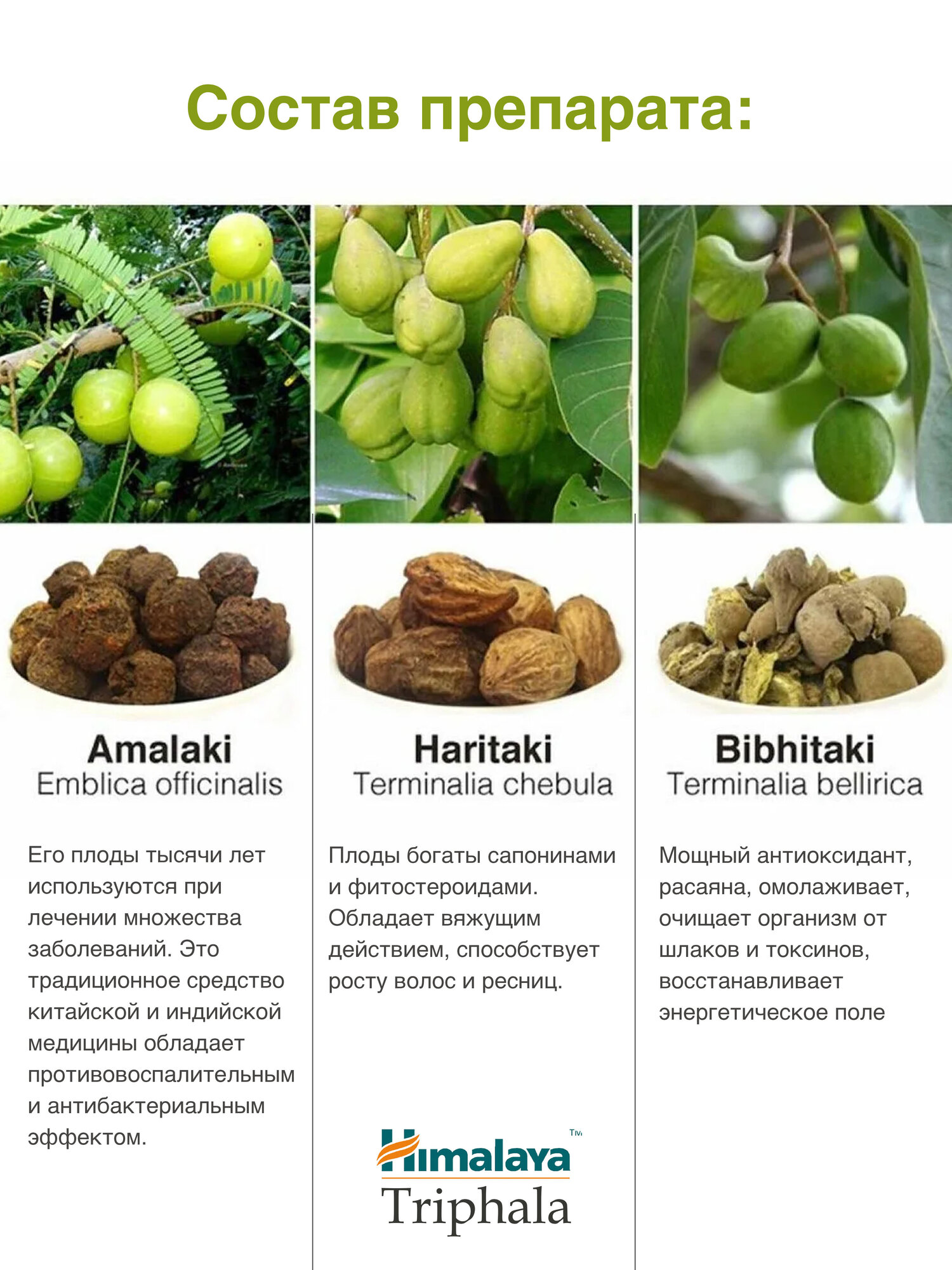 | Состав | Амла (Emblica officinalis), Бибхитаки (Terminalia belerica), Харитаки (Terminalia chebula). |