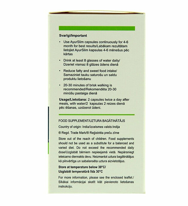 | Способ применения и дозы | 2 капсулы дважды в день после завтрака и ужина, в течение как минимум 3-6 месяцев. AyurSlim следует принимать в сочетании со сниженной калорийностью питания и получасовыми физическими упражнениями ежедневно. |