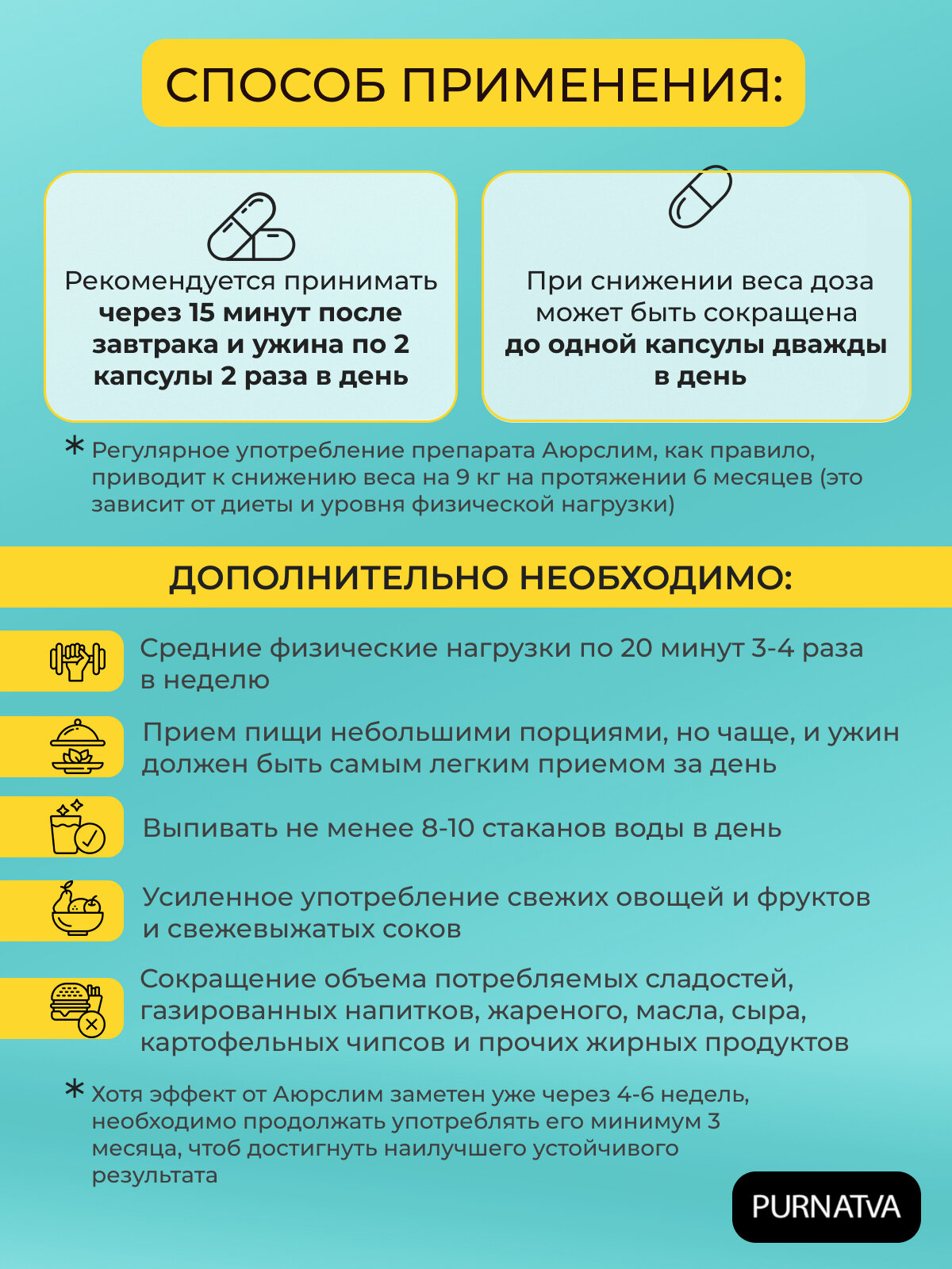 | Противопоказания | применение капсул AyurSlim противопоказано пациентам с желтухой и почечной недостаточностью. Пациентам, которые уже страдают диабетом, проблемами с сердцем и высоким артериальным давлением, рекомендуется принимать капсулы AyurSlim под медицинским наблюдением. Если вы чувствительны к любому ингредиенту в аюрслиме, то применение противопоказано. |