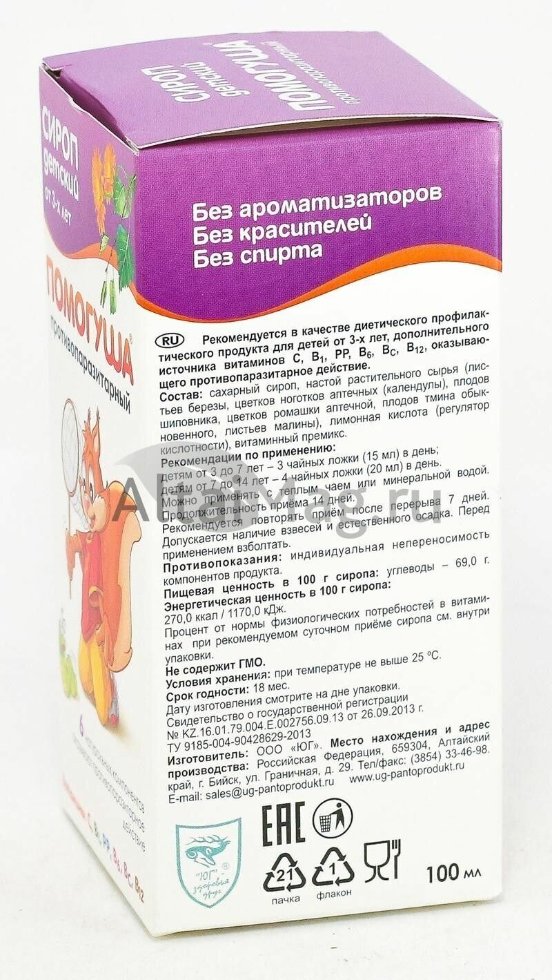 Ниже Вы можете прочитать отзывы на Помогуша Противопаразитарный сироп детский, 100 мл. Алтайское натуральное средство от паразитов для детей с 3 лет, ознакомится с подробными характеристиками, посмотреть интересные обзоры и фотографии на Помогуша Противопаразитарный сироп детский, 100 мл. Алтайское натуральное средство от паразитов для детей с 3 лет.