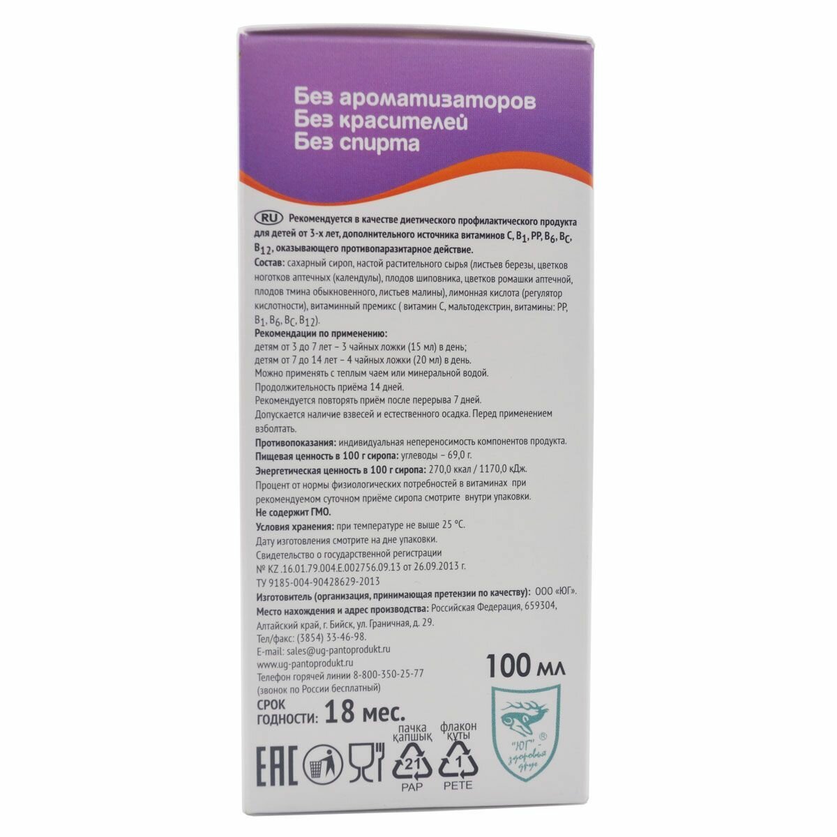 | Состав | Сахарный сироп, настой растительного сырья (листьев берёзы, цветков ноготков аптечных (календулы), плодов шиповника, цветков ромашки аптечной, плодов тмина обыкновенного, листьев малины), лимонная кислота (регулятор кислотности), витаминный премикс. Не содержит ГМО. |