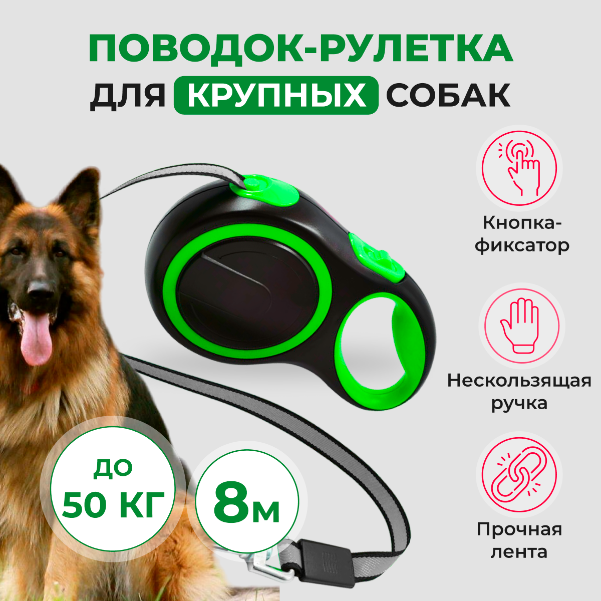 Поводок для крупных собак до 50 кг, длина рулетки 8 метров, зеленый интересное:
