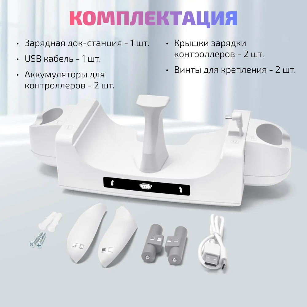 | Комплектация | Зарядная док-станция - 1 шт. USB кабель - 1 шт. Аккумуляторы для контроллеров - 2 шт. Крышки зарядки контроллеров - 2 шт. |