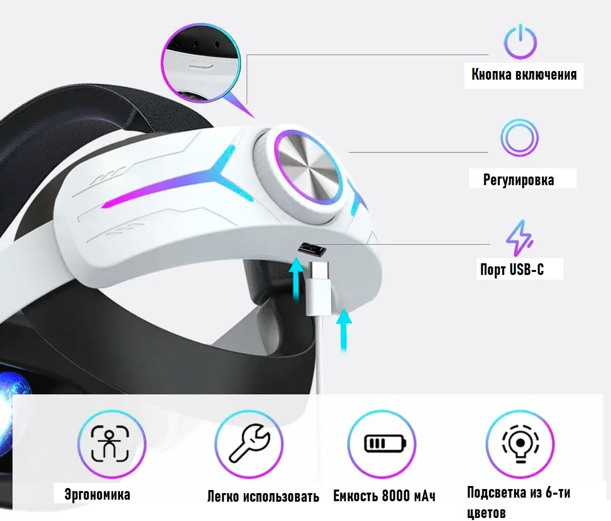 Крепление головное с аккумулятором 8000 mAh для Meta Quest 3 (белое) интересное: