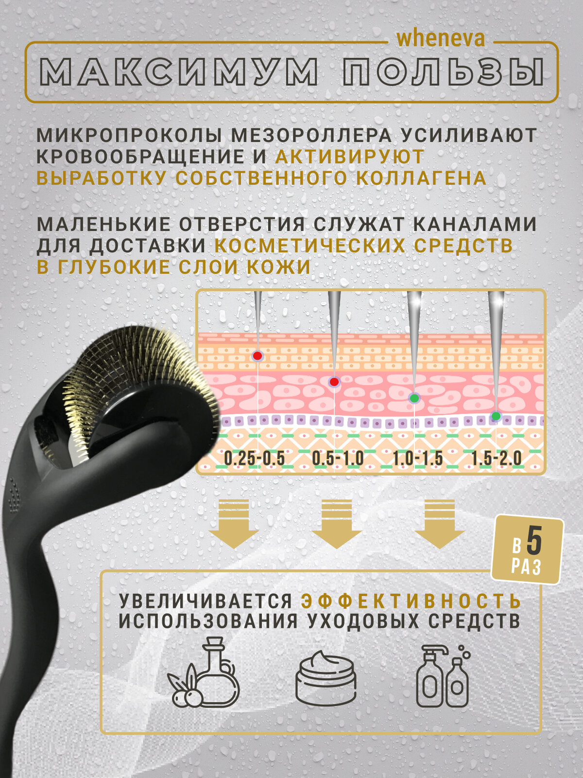 Мезороллер для роста и густоты волос, с гипоаллергенными позолоченными титановыми иглами 1,5мм