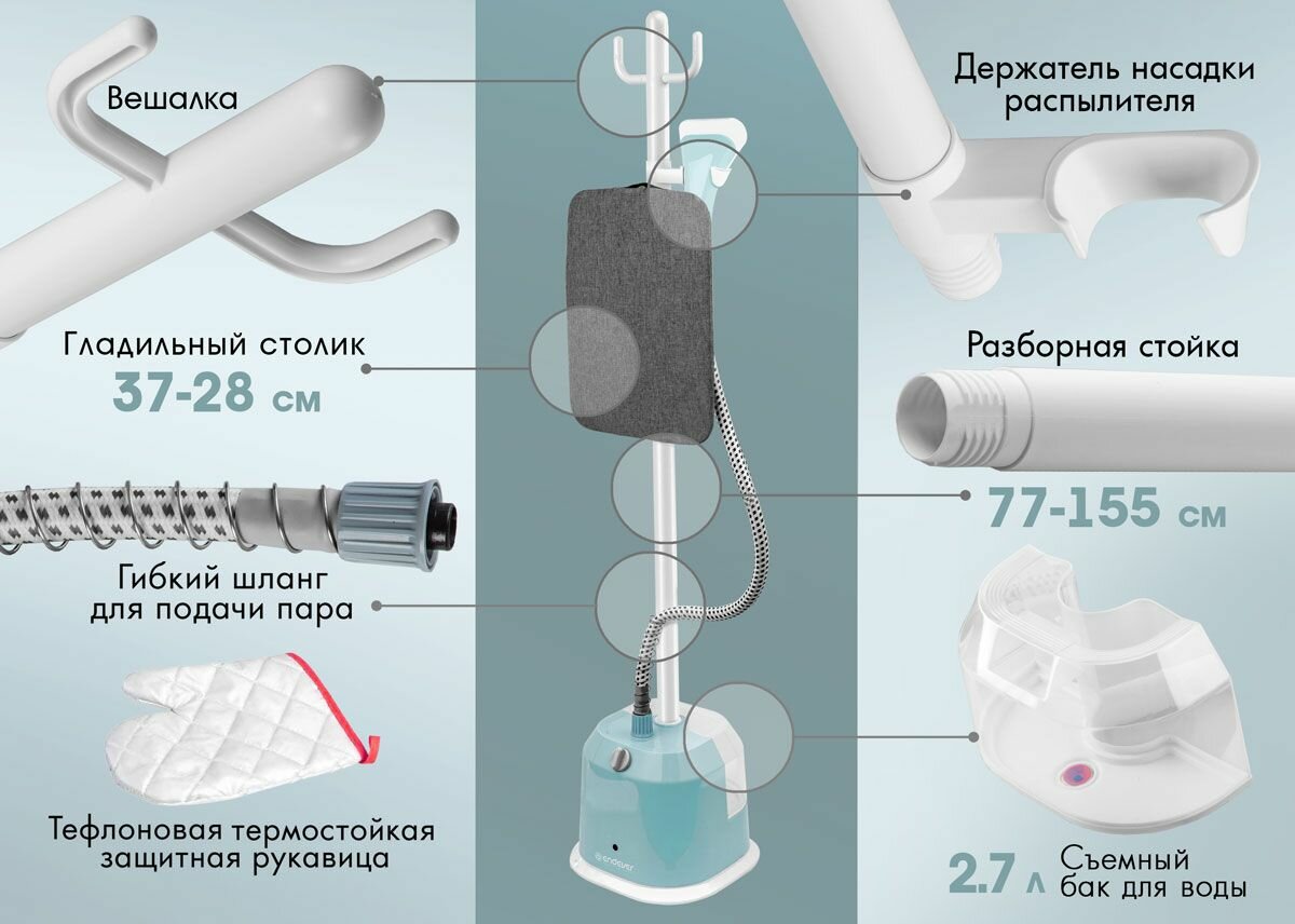 | Особенности конструкции | съемный резервуар для воды, телескопическая стойка |