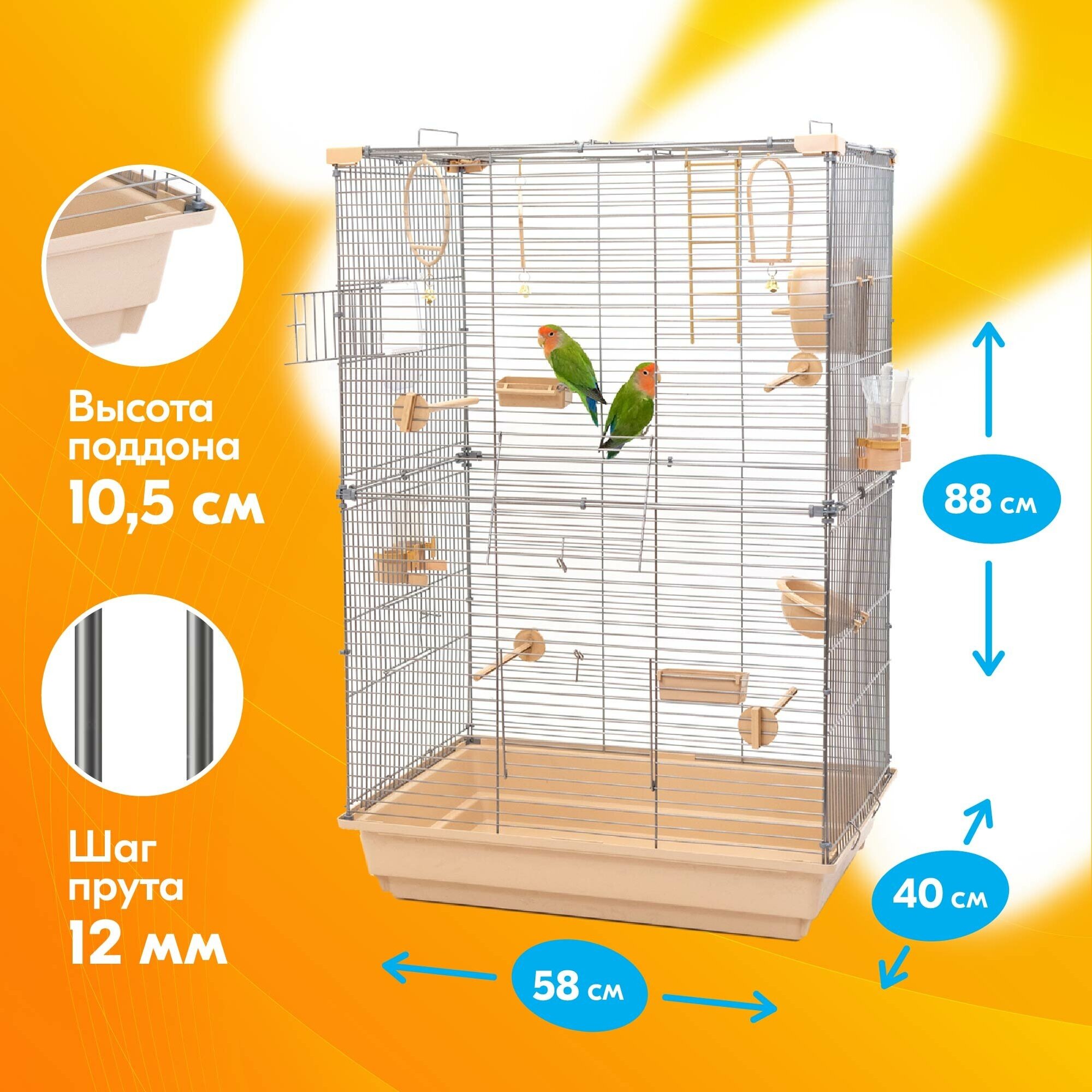 Купить Клетка для птиц 88 х 58 х 40см: для попугая, для канарейки ЛОФТ-2 разборная "PetTails", 2 секции, шаг прута 12мм, бежевая