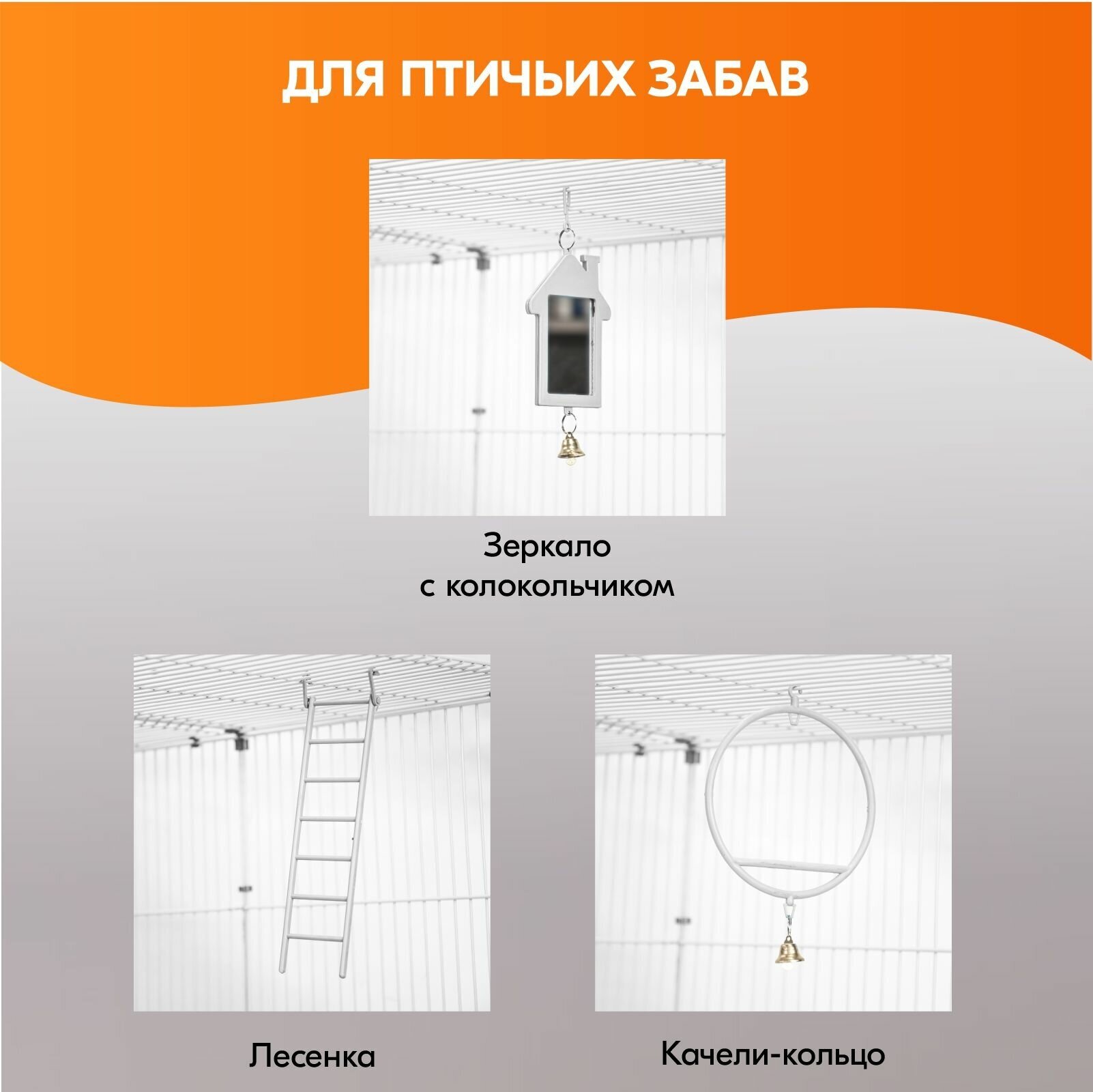 | Комплектация | Стенки клетки, крыша клетки, комплект креплений, 1 поилка 100мл, 1 кормушка с воронкой 75мл, 1 прямоугольная кормушка, 1 зеркало с колокольчиком 50*70мм, 1 качели в виде кольца с колокольчиком, 4 палочки 18,5см, 1 лесенка с разноосным креплением, 1 скворечник, 1 купалка для птиц. |