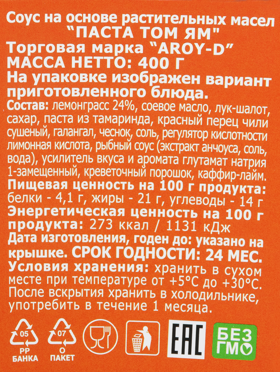 | Состав | лемонграсс 24%, соевое масло, сахар, лук-шалот, галангал, красный перец чили сушеный, чеснок, мякоть тамаринда, соль, регулятор кислотности лимонная кислота, усилитель вкуса и аромата глутамат натрия, рыбный соус (экстракт анчоуса, соль, вода), каффир-лайм, креветочный порошок. |