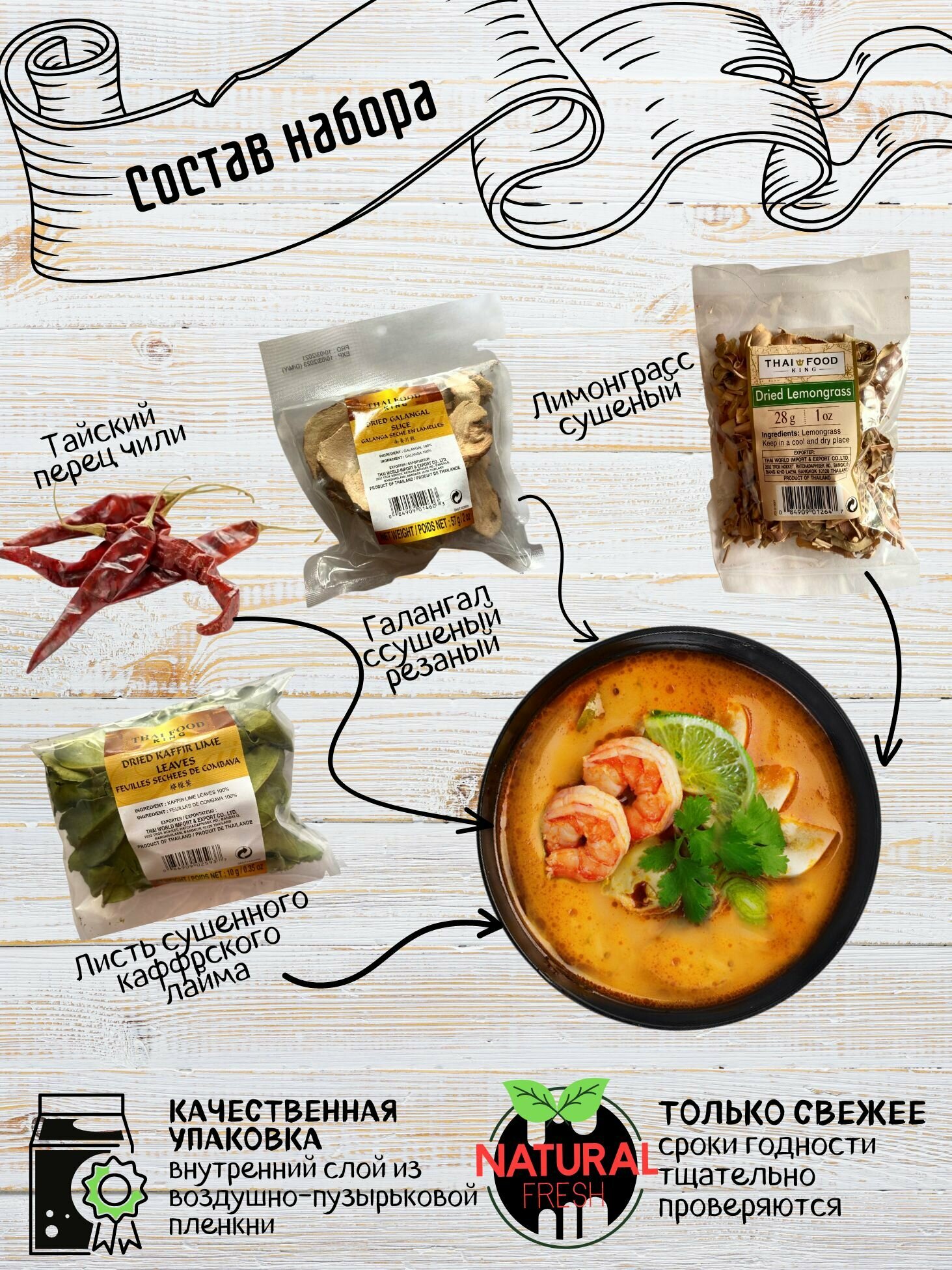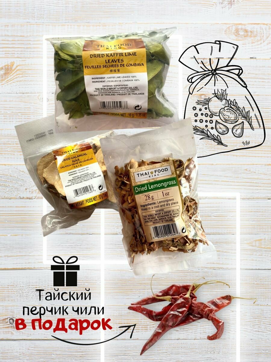 | Состав набора | В наборе натуральные ингредиенты из Таиланда. В наборе содержатся отдельно упакованный: сушеный лемонграсс 28 гр; листья сушеного лайма 10 гр; резаный галаган 57 гр; острый перец "Птичий глаз" 5 гр. |