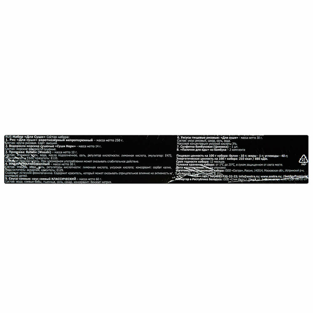 | Состав | Рис «Для суши» короткозерный непропаренный – крупа рисовая. Водоросли морские сушеные «Суши Нори» - морские водоросли сушеные. Соусы столовые: Приправа Васаби – вода, порошок японского хрена Васаби, масло подсолнечное, корень хрена, крахмал кукурузный, перец кайенский молотый, соль, эмульгатор: Е 472d, краситель: Е141, консервант: сорбат калия. Имбирь маринованный – имбирь, вода, соль, регуляторы кислотности: лимонная кислота, уксусная кислота |