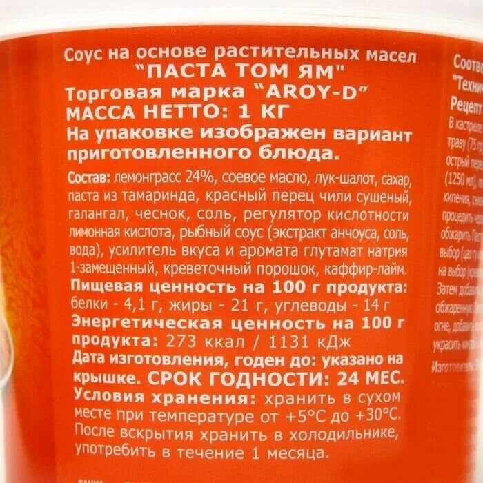 | Состав | Лемонграсс, соевое масло, сахар, лук-шалот, галангал, красный перец чили сушеный, чеснок, мякоть тамаринда, соль, регулятор кислотности лимонная кислота, усилитель вкуса и аромата глутамат натрия, рыбный соус (анчоус, соль, вода), креветочная паста (креветки, соль), каффир-лайм. |