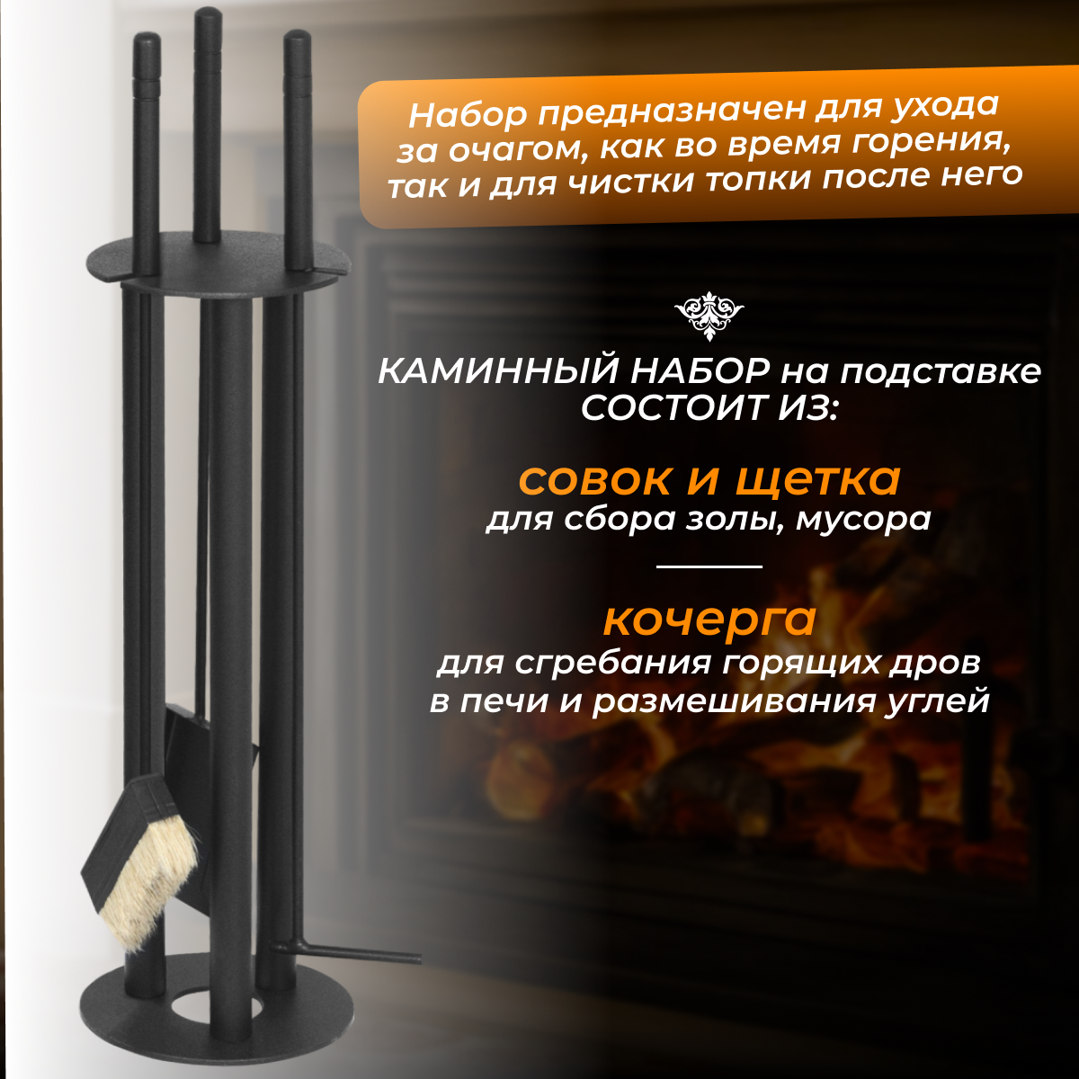 | Состав набора | кочерга / подставка / совок / щётка |