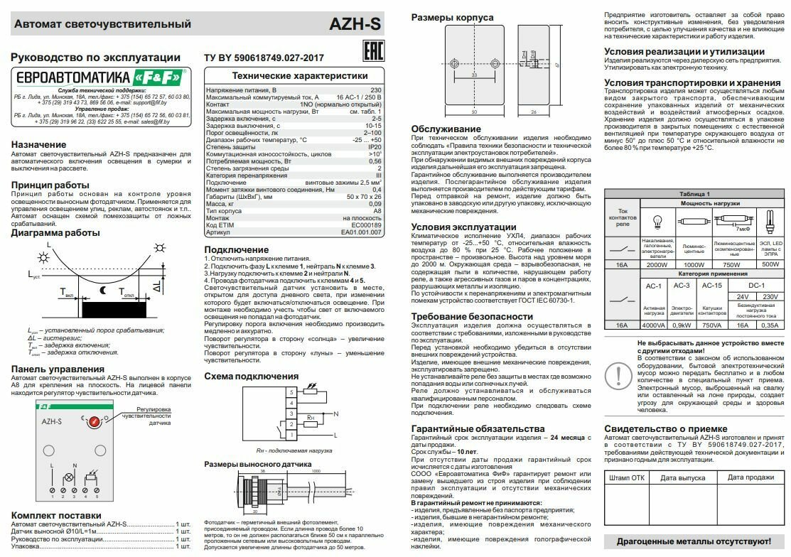 Фотореле F&f AZH-S, с выносным герметичным фотодатчиком, EA01.001.007 интересное: