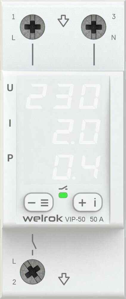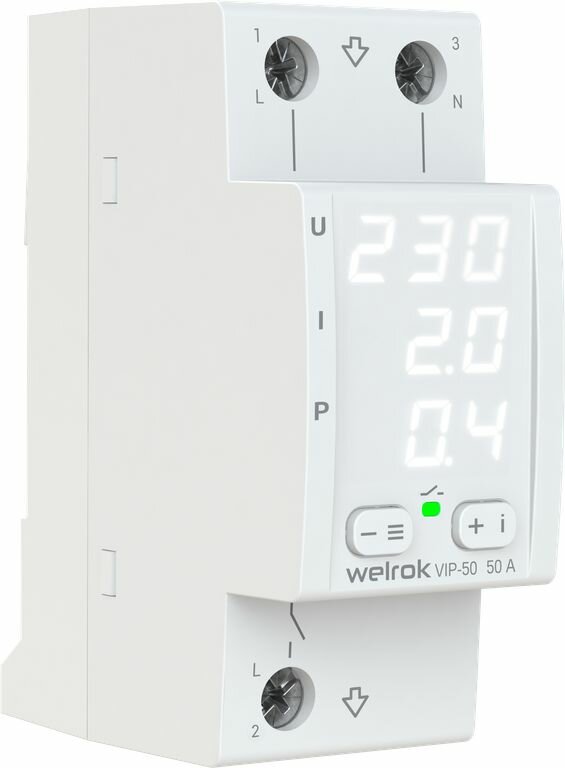 Реле напряжения с контролем тока и мощности Welrok VIP-40 белый индикатор