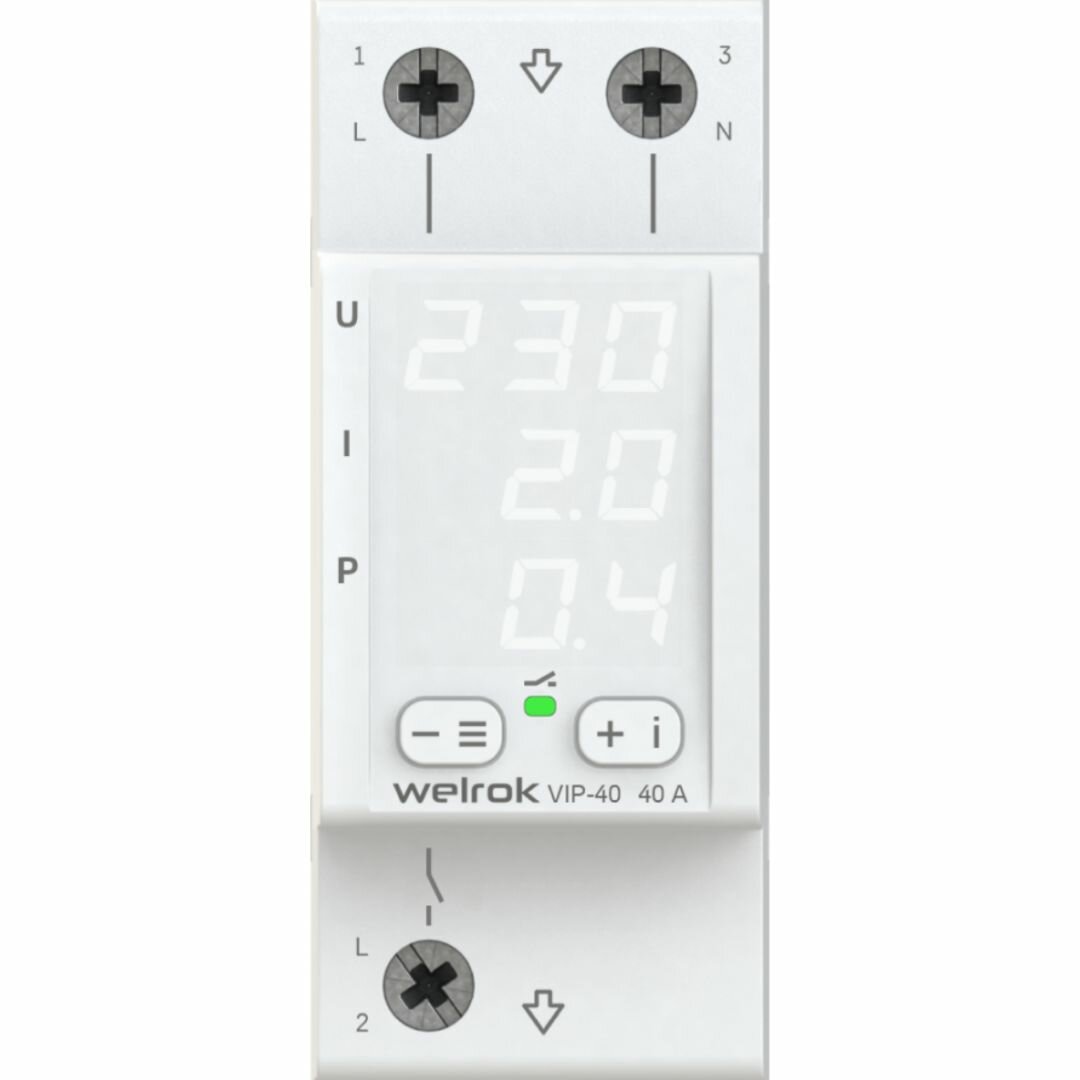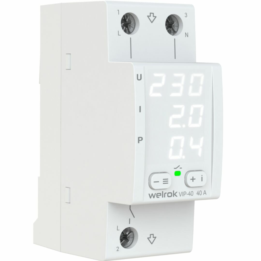 Реле напряжения с контролем тока и мощности Welrok VIP-40 белый индикатор