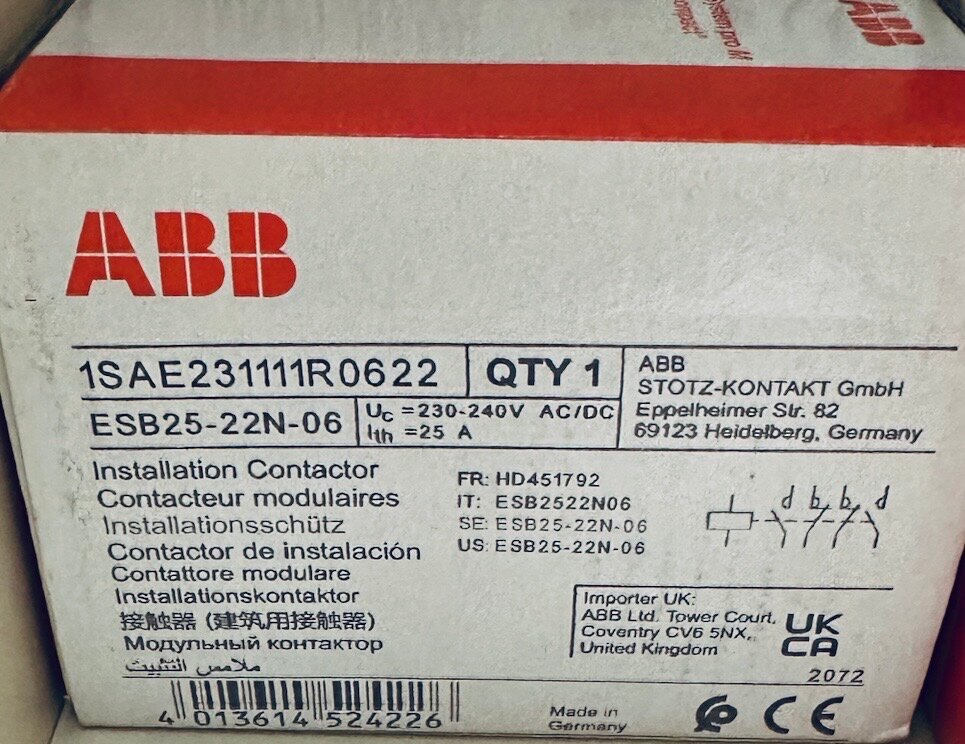 Ниже Вы можете прочитать отзывы на Контактор ESB25-22N-06 модульный (25А АС-1, 2НО+2НЗ), катушка 230В AC/DC, ABB 1SAE231111R0622 (1 шт.), ознакомится с подробными характеристиками, посмотреть интересные обзоры и фотографии на Контактор ESB25-22N-06 модульный (25А АС-1, 2НО+2НЗ), катушка 230В AC/DC, ABB 1SAE231111R0622 (1 шт.).