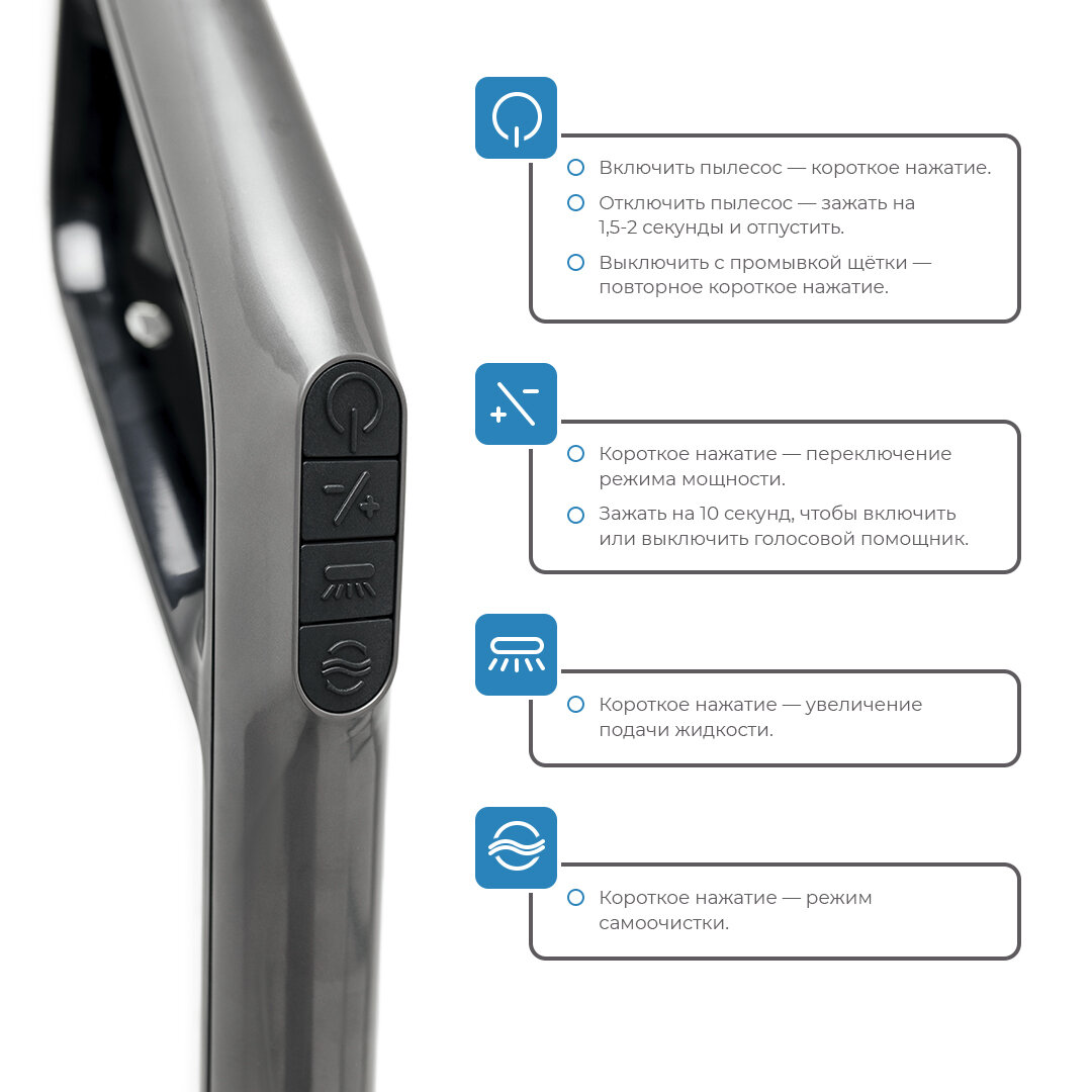 | Особенности конструкции | вертикальная парковка / датчик распознавания загрязненности / индикатор заполнения пылесборника / управление мощностью на рукоятке |
