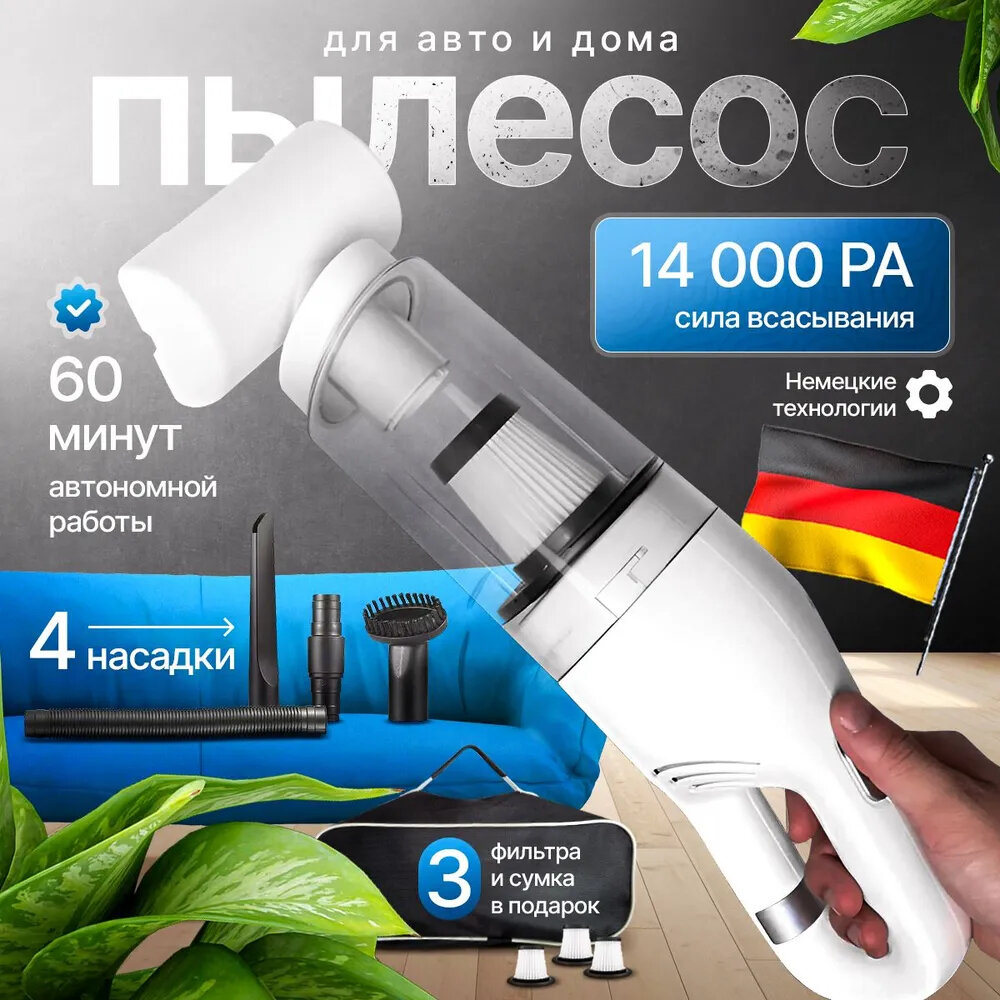 Пылесос ручной аккумуляторный для автомобиля и дома, Белый, 120W, 4000mAh
