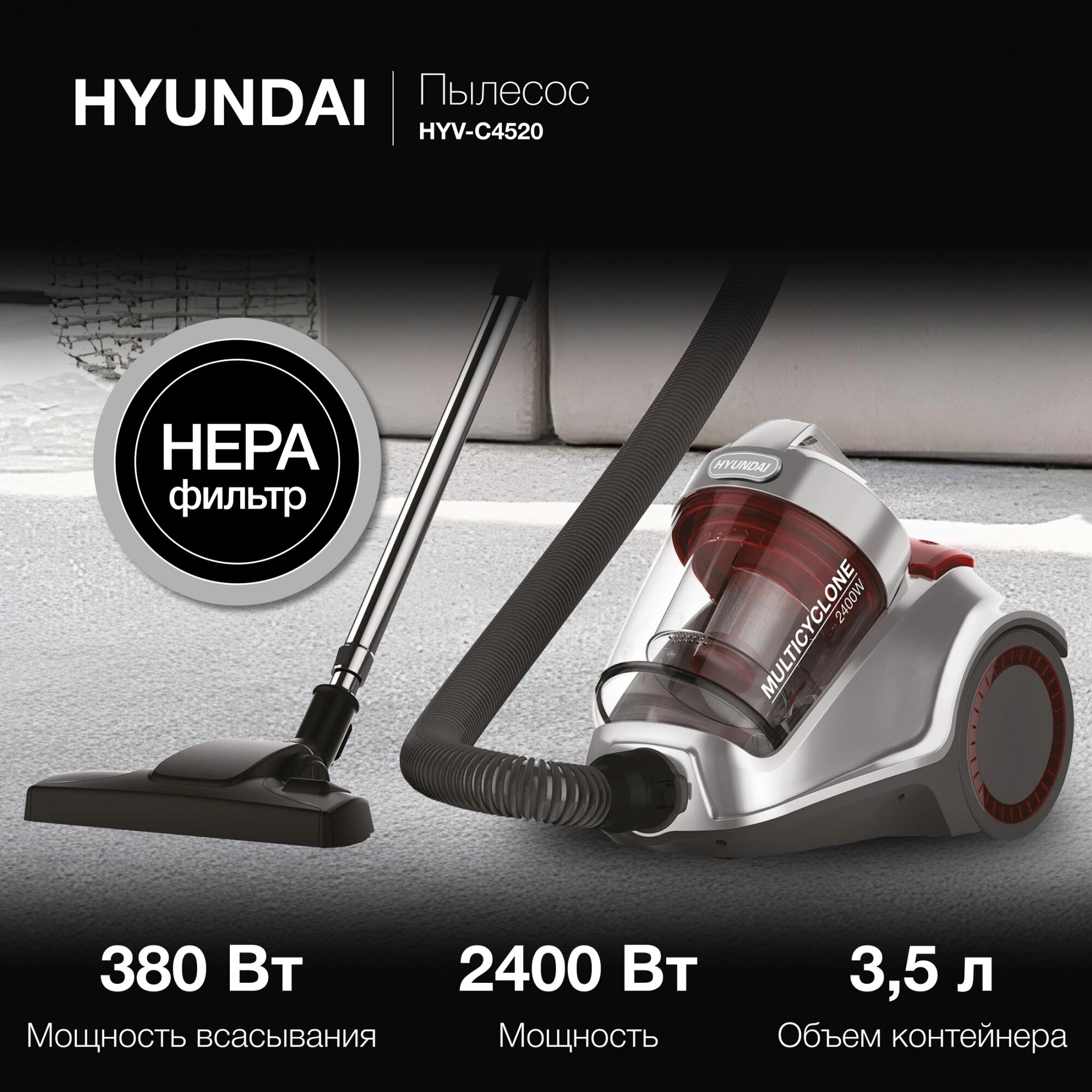 Пылесос HYUNDAI HYV-C4575, 2400 Вт, 380 Вт