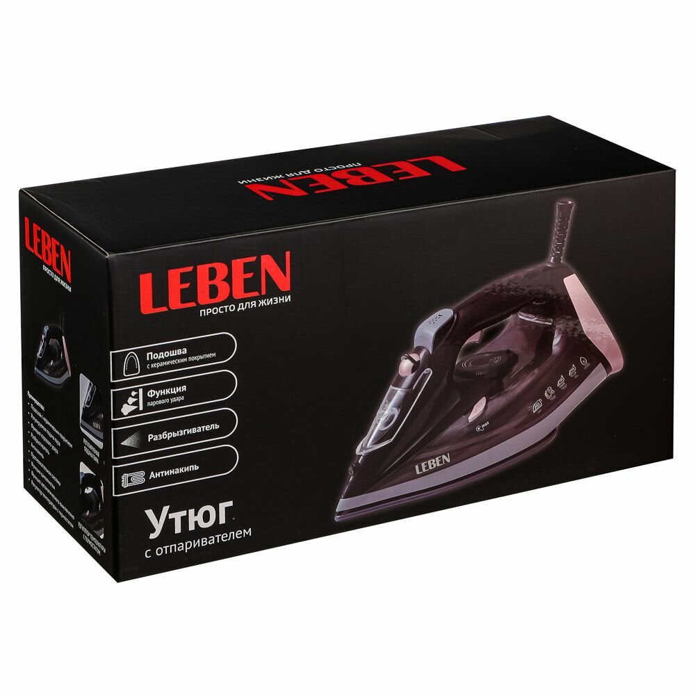 | Дополнительная информация | LEBEN Утюг с отпаривателем 2600Вт, керамика, антикапля, антинакипь, автовыкл., бак для воды 480мл |