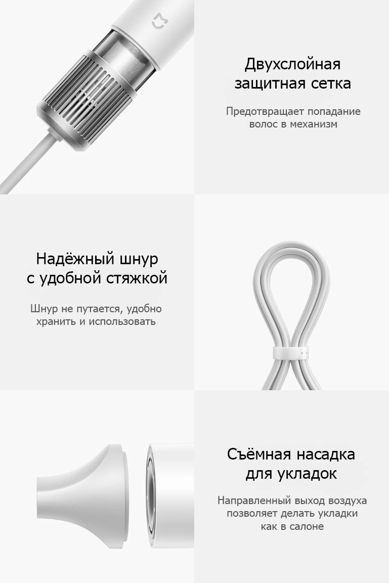 | Дополнительная информация | фен Xiaomi Mijia Dryer H501 работает с поразительной скоростью 110 000 оборотов в минуту, что позволяет сушить волосы за считанные минуты. |
