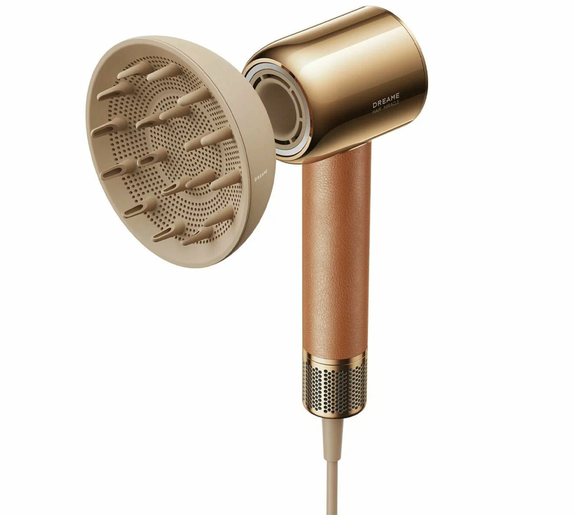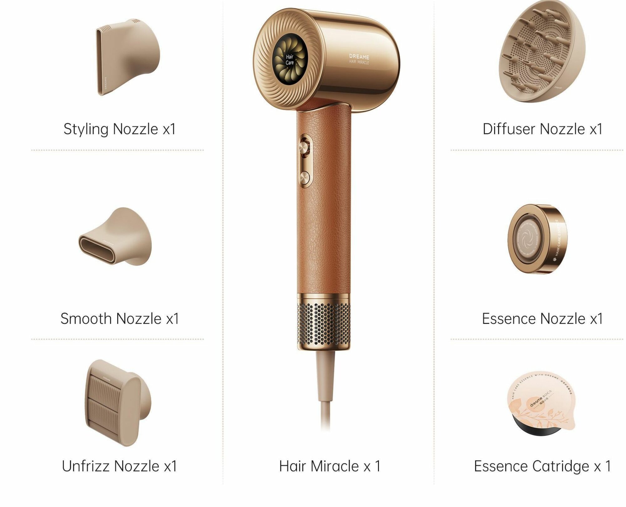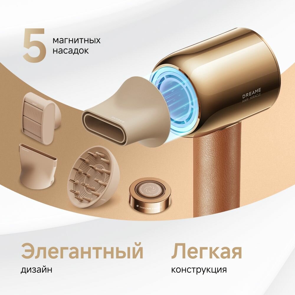 Купить Высокоскоростной фен для волос Dreame Hair Miracle, 1600 Вт, защита от перегрева, ионизация, 4 температурных режима, 4 скорости, 5 магнитных насадок и кожаный кейс, золотой