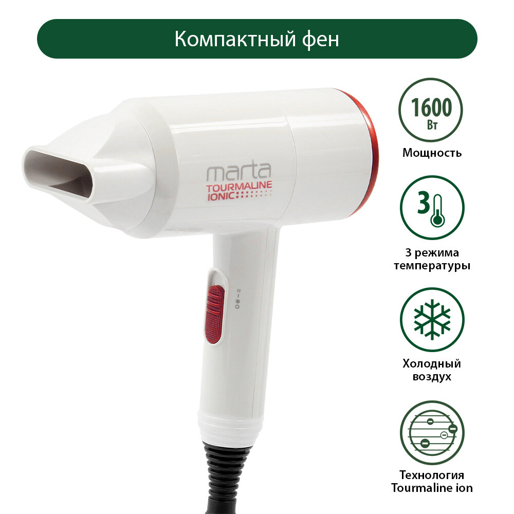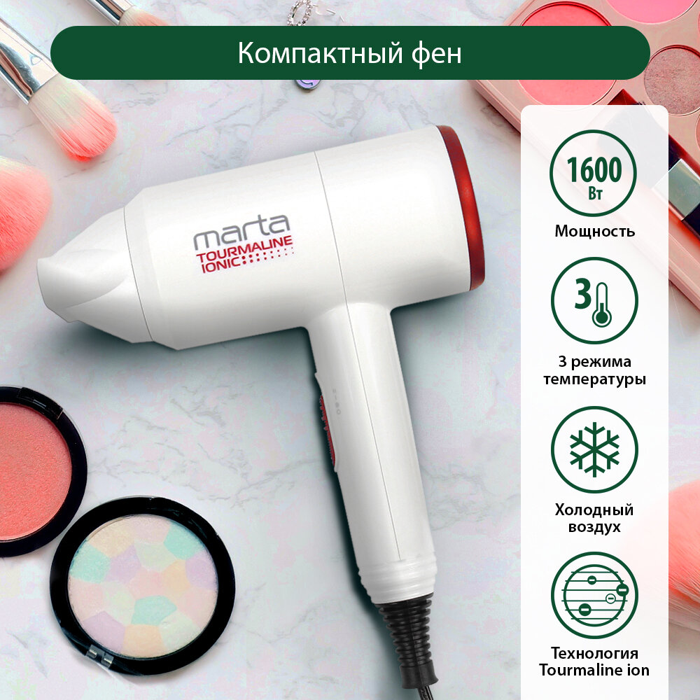 Купить Фен MARTA MT-1267 белый коралл Технология tourmaline ionic
