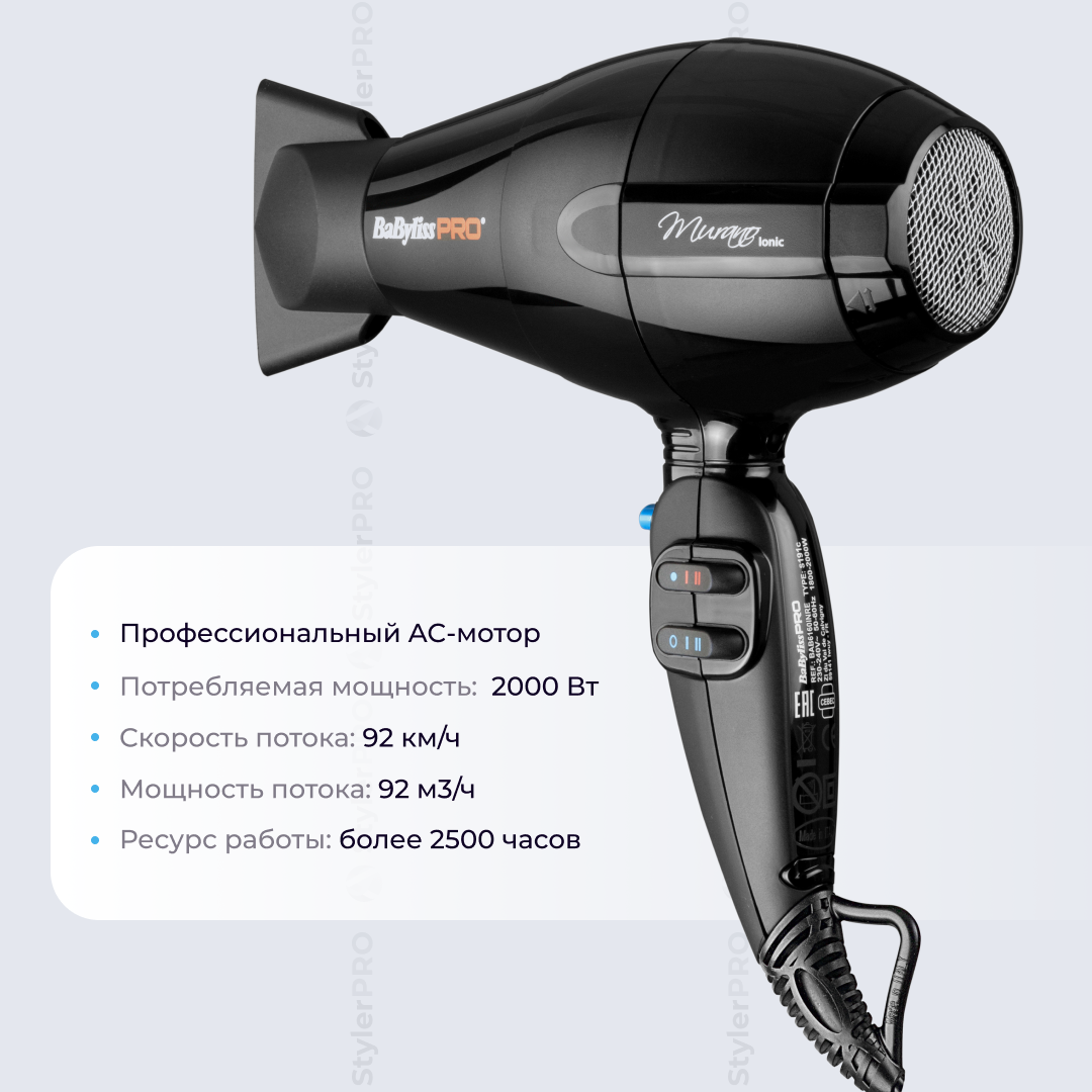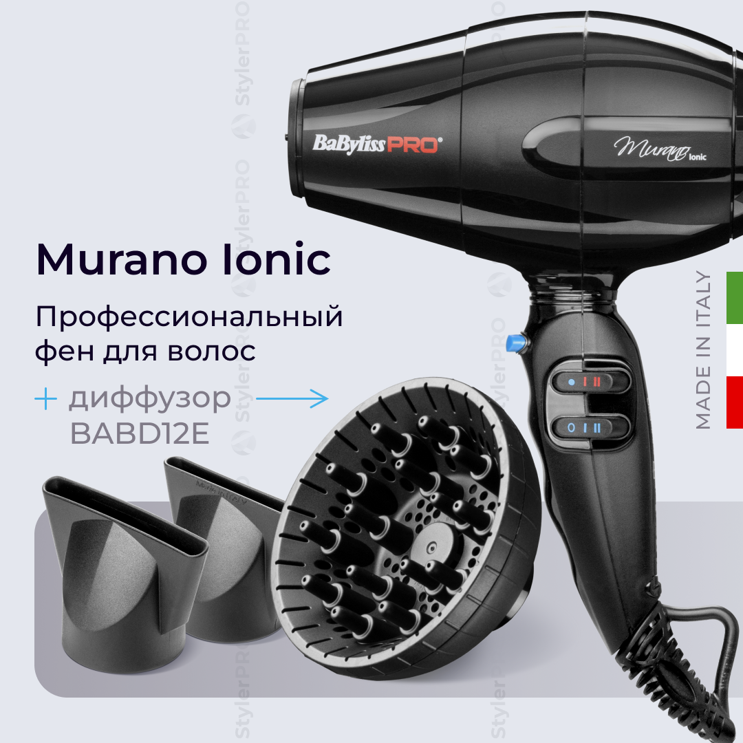 Фен BaByliss Pro Murano Ionic BAB6160INRE с диффузором BABD12E, профессиональный, с ионизацией, 2000 Вт, ультракомпактный интересное: