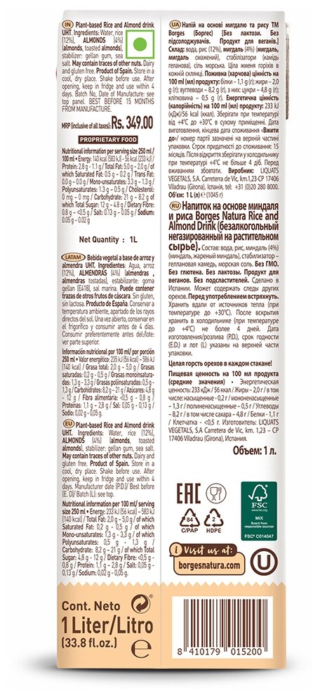 | Состав | вода из горных источников подготовленная, рис, миндаль (4%) (миндаль, жареный миндаль), стабилизатор - геллановая камедь, морская соль |