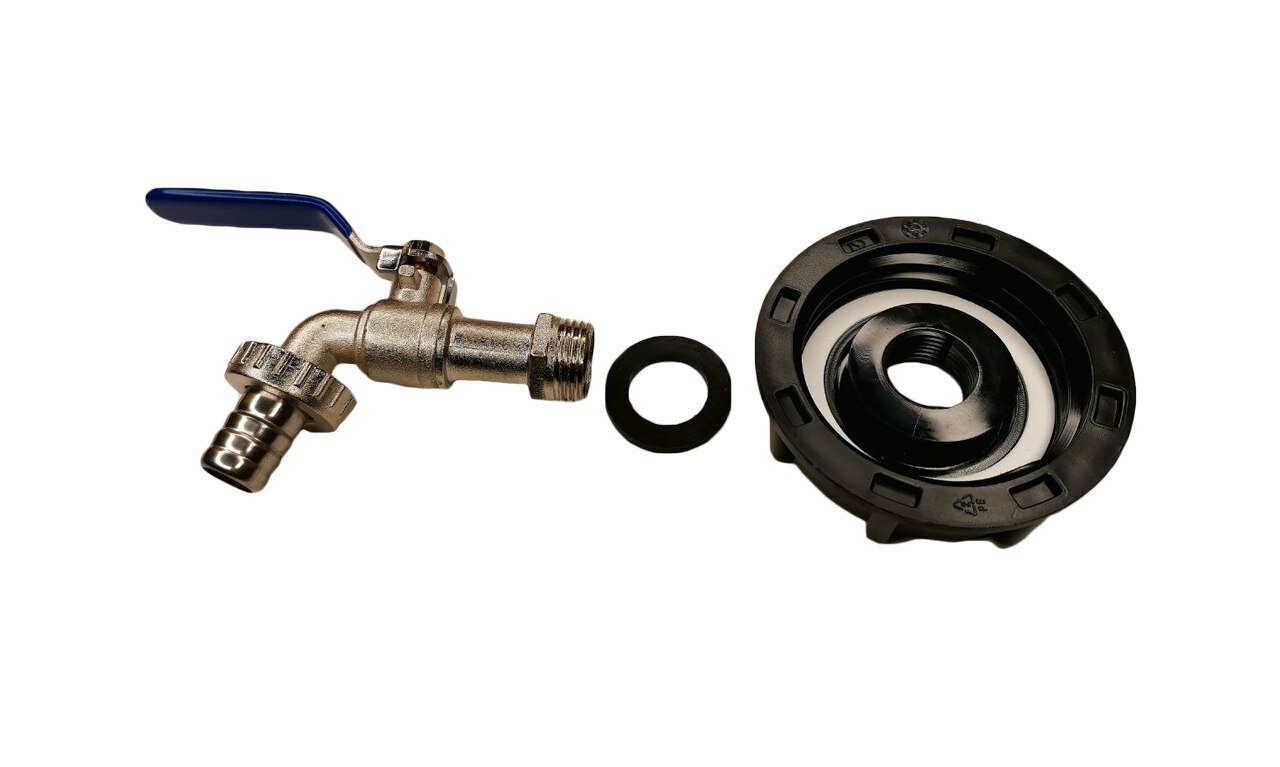 Кран на Еврокуб 1" / Переходник для Еврокуба / Вход 60мм крупная резьба, шаг 6мм, выход штуцер 25мм
