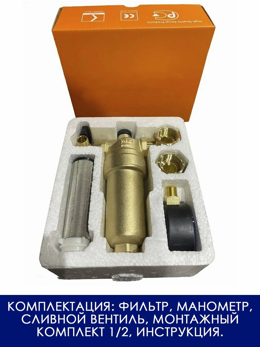 Купить Фильтр прямой с манометром промывной универсальный для горячей и холодной воды с редуктором давления 1/2"