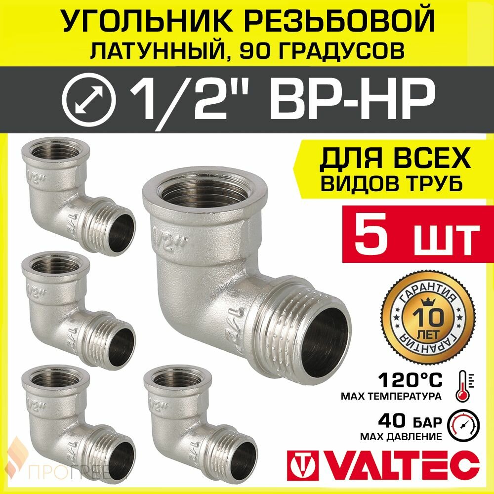 5 шт - Угольник 90 гр. 1/2" ВР-НР VALTEC, латунный никелированный / Резьбовой фитинг угловой ДУ 15 для монтажа труб, арматуры в системе отопления и водоснабжения, арт. VTr.092. N.0004