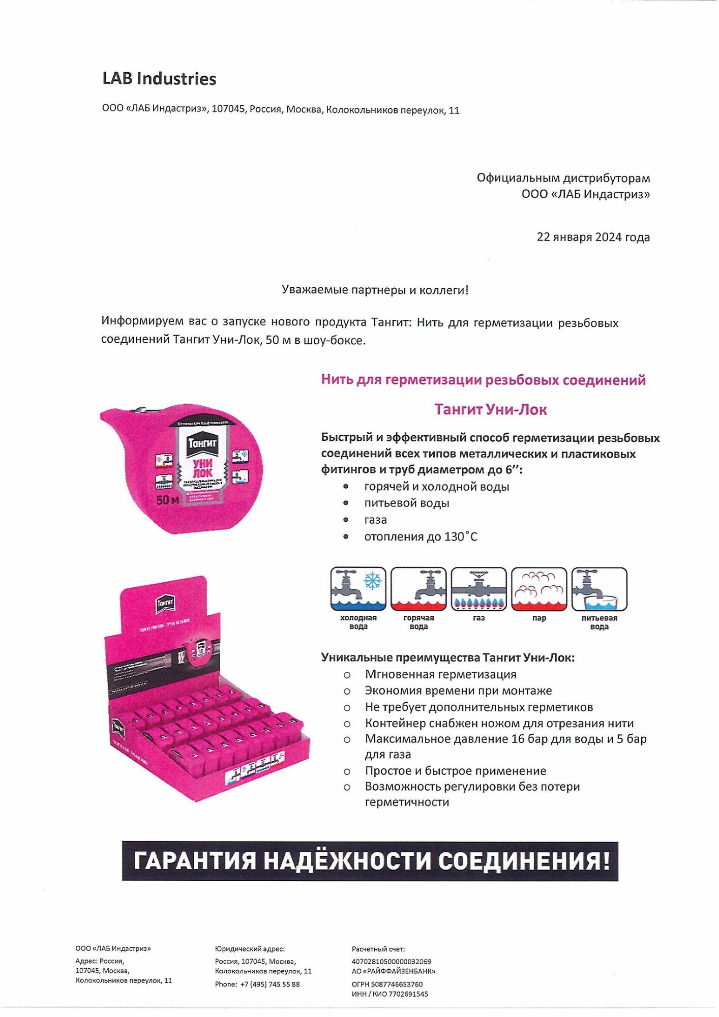 Ниже Вы можете прочитать отзывы на Нить (нитка) сантехническая 50м монтажная Тангит Уни-Лок, для герметизации резьбовых соединений, ознакомится с подробными характеристиками, посмотреть интересные обзоры и фотографии на Нить (нитка) сантехническая 50м монтажная Тангит Уни-Лок, для герметизации резьбовых соединений.