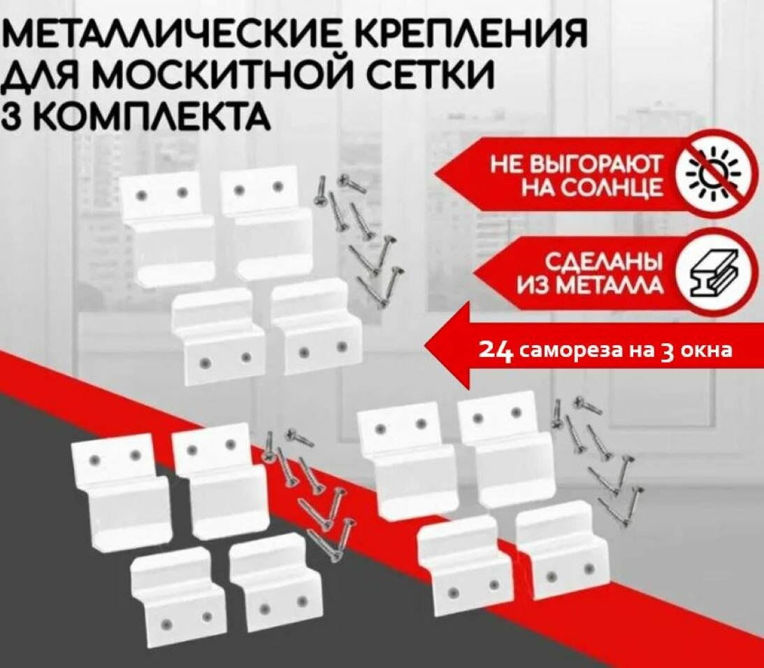 Купить Крепление для москитной сетки на 3 окна (верх-6шт., низ-6 шт., саморезы - 24шт) металл белый