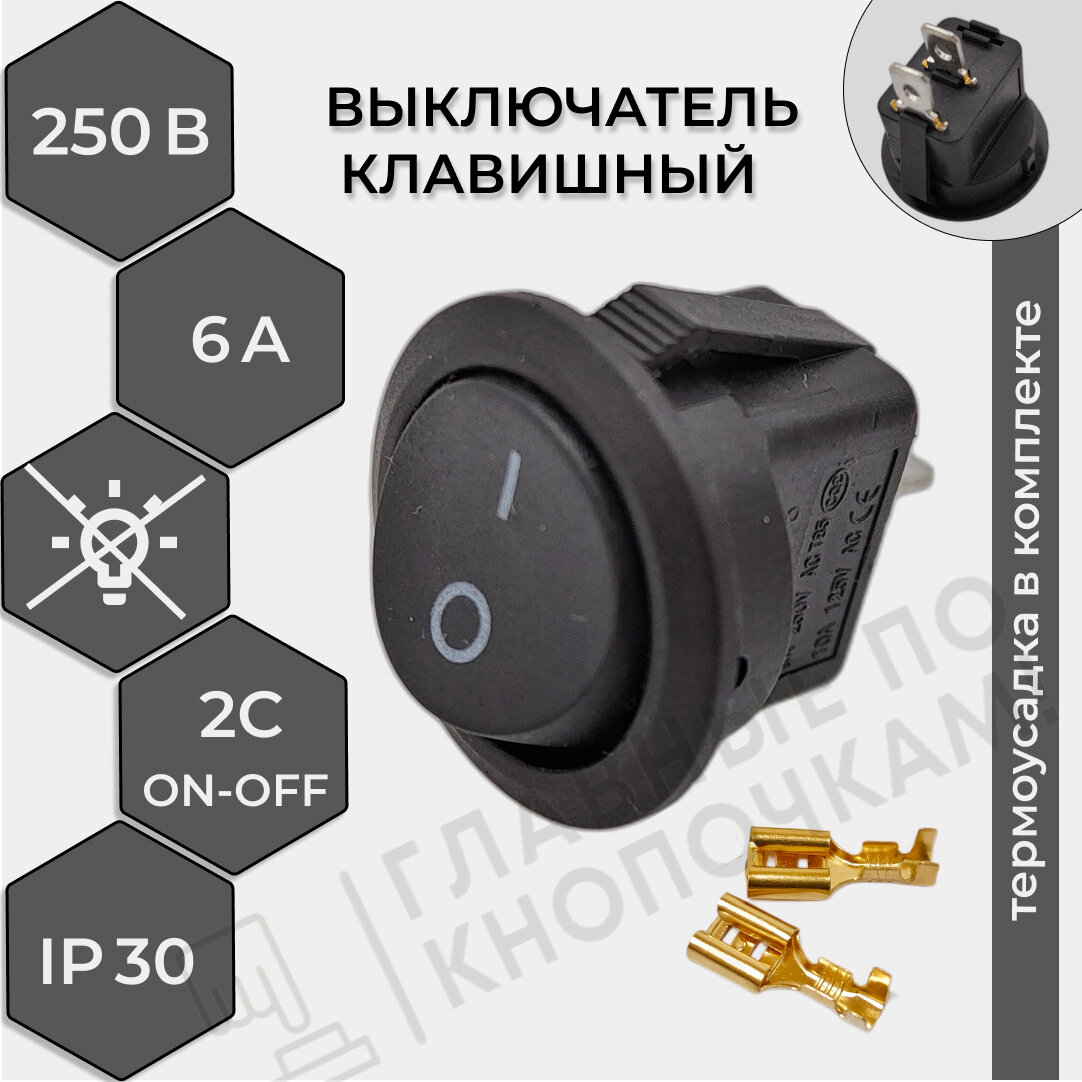 Выключатель клавишный круглый 250V 6А (2с) ON-OFF комплект 2 шт, черный (+ клеммы и термоусадка)