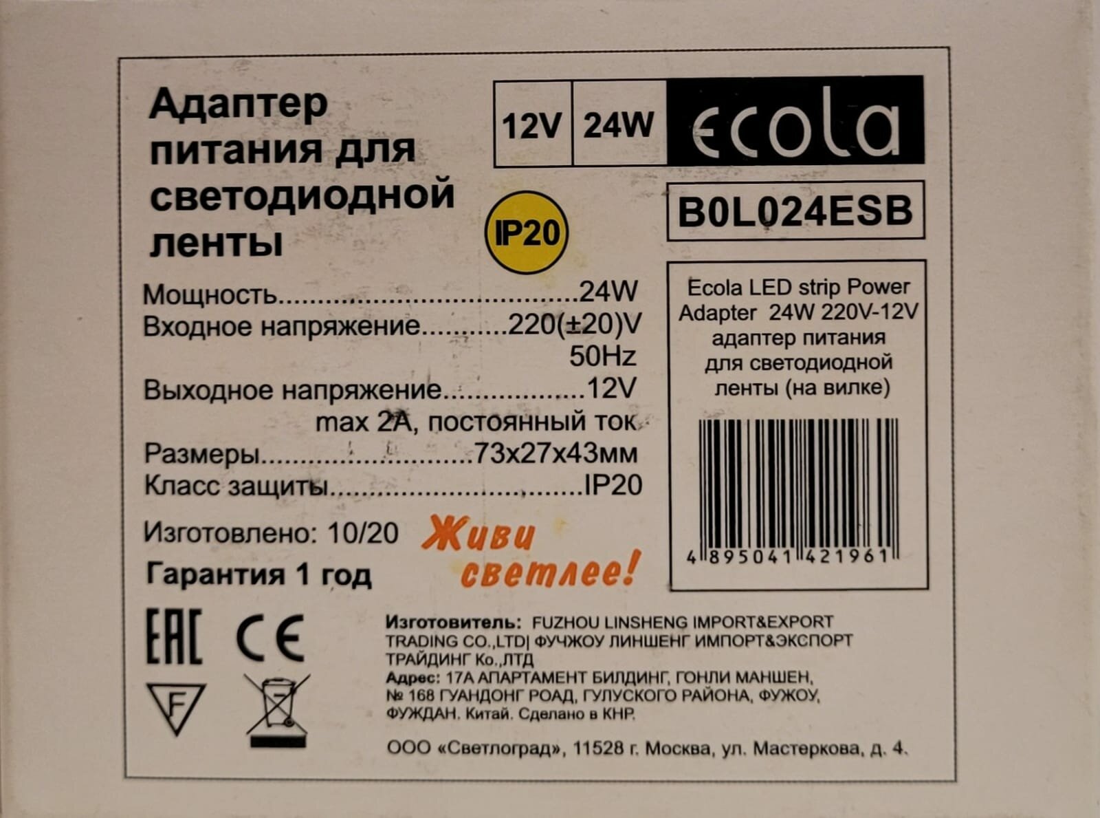 Адаптер питания (12В, 2000mA, 5,5mm) Ecola B0L024ESB интересное: