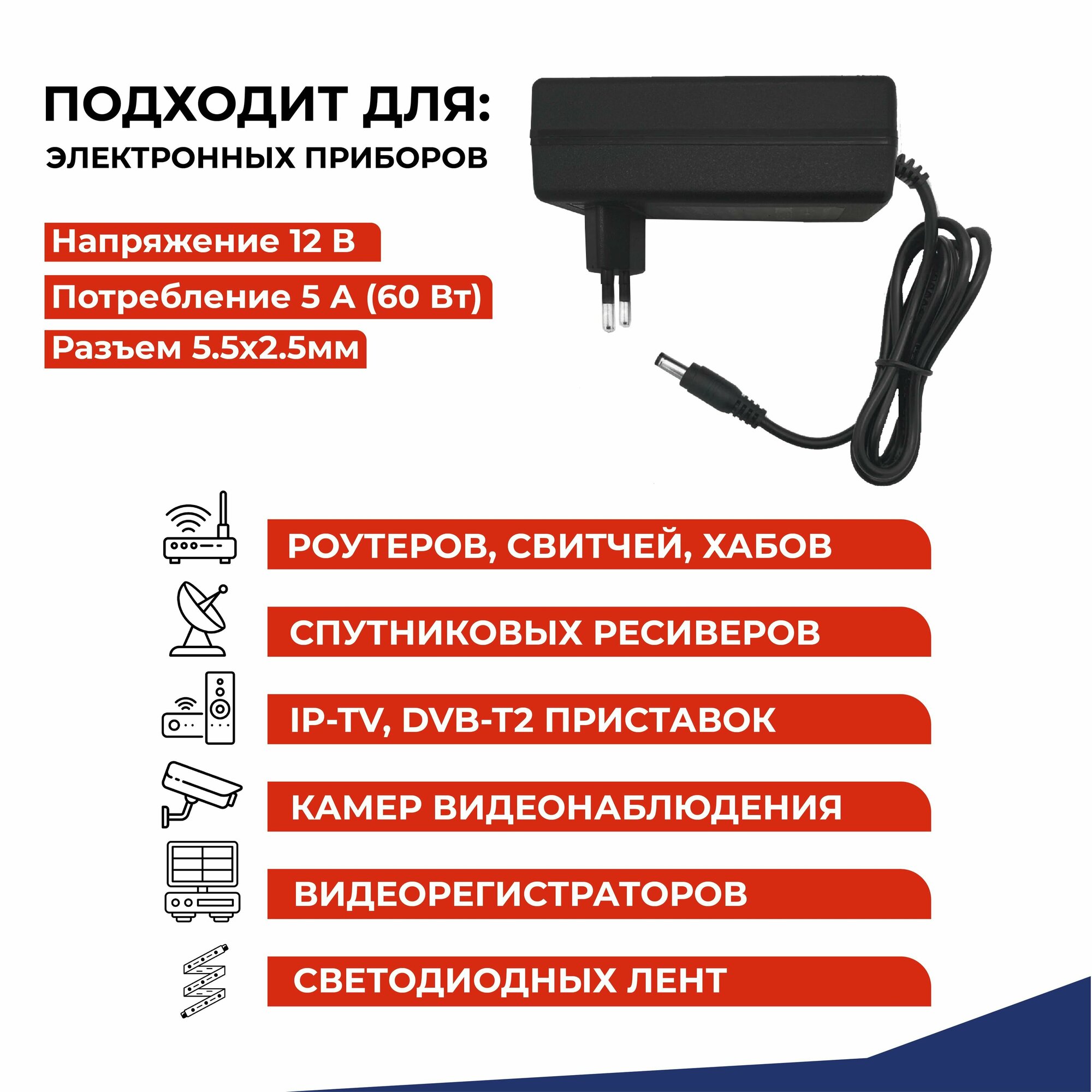 Блок питания 12В 5А, штекер 5.5х2.5 мм, универсальный адаптер питания 12V 5А. Подходит для ТВ приставок, видеокамер, бытовой техники, светодиодных лент. Без индикатора работы интересное: