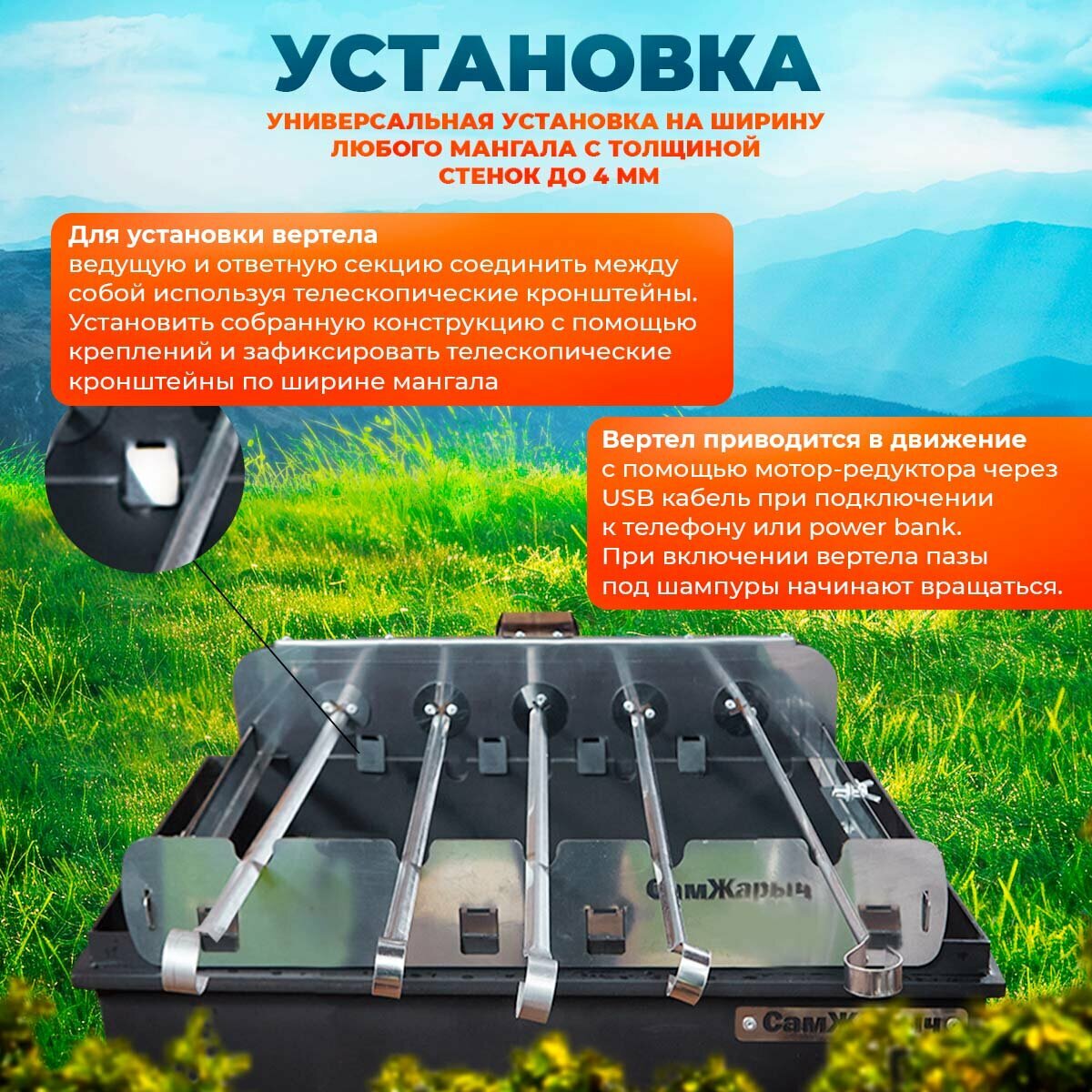 Ниже Вы можете прочитать отзывы на Электровертел для мангала на 5 шампуров, ознакомится с подробными характеристиками, посмотреть интересные обзоры и фотографии на Электровертел для мангала на 5 шампуров.