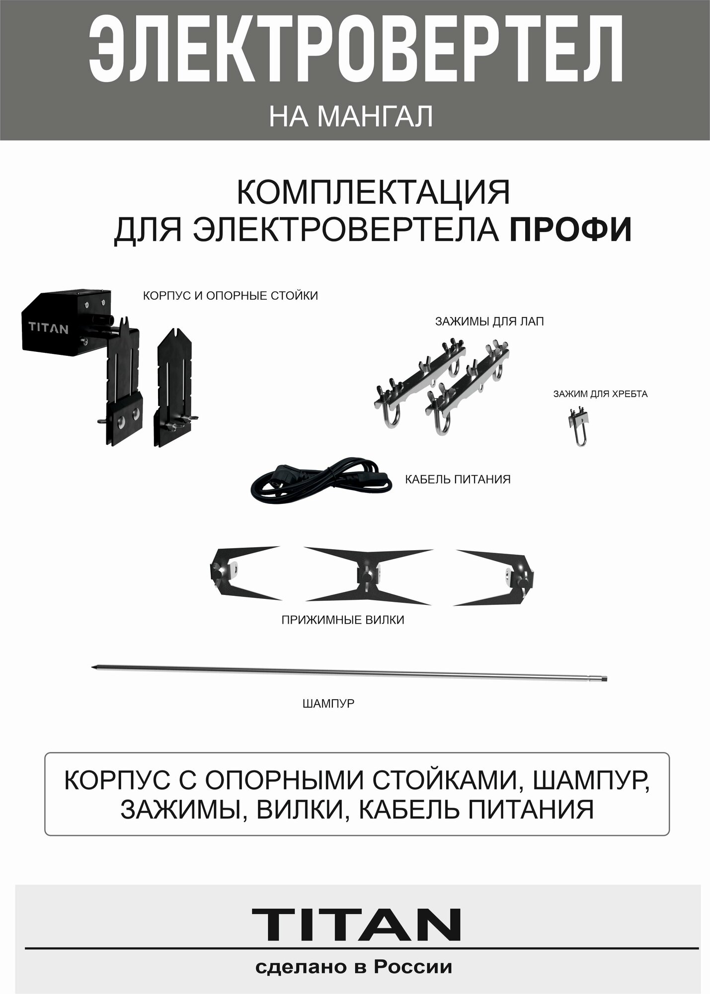 | Дополнительная информация | Вертел., Шампур 1300мм., 2 вилки боковые., 1 промежуточная., 2 распорки для лап., зажим для позвоночника., сетевой кабель, паспорт |