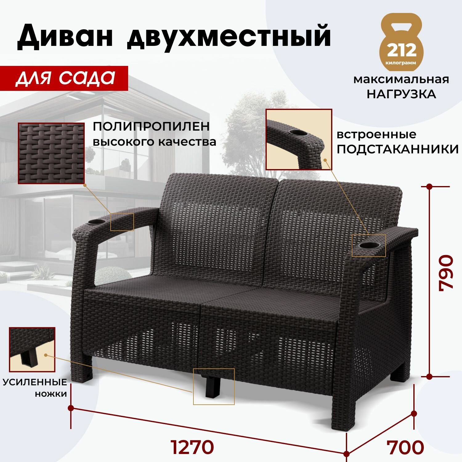 Купить Диван садовый из ротанга, 2-х местный, 127х70х79 см, мокко