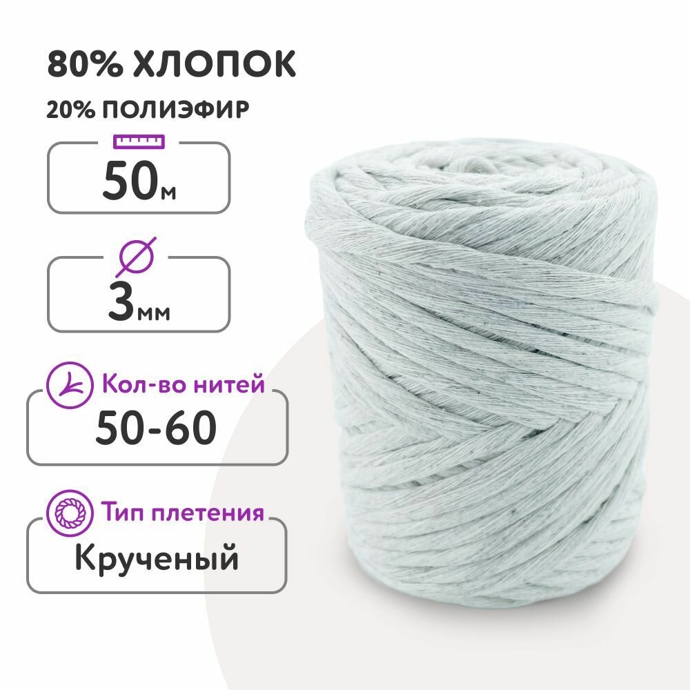 Шнур для макраме 80% хлопок 50м/ 3мм/ светло-серый