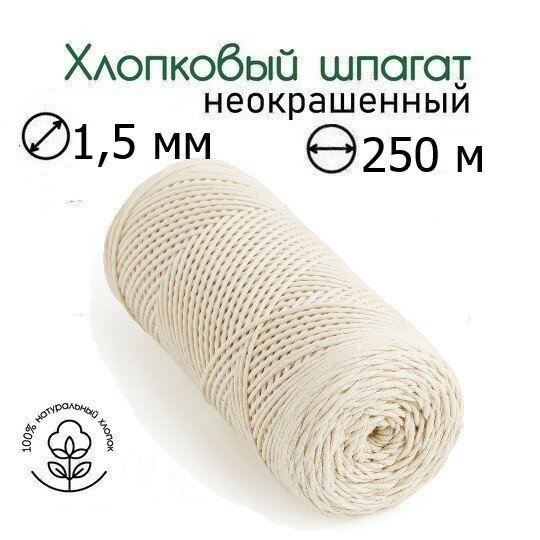 Шпагат хлопковый 1,5 мм 250 м неокрашенный для макраме, вязания, рукоделия интересное: