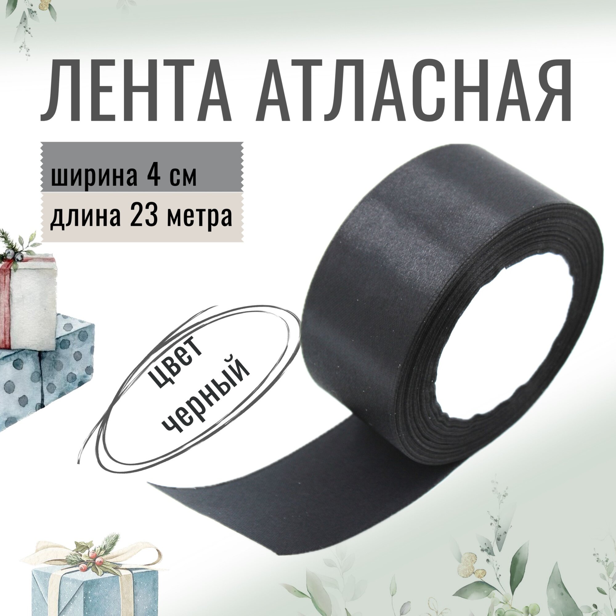 Лента атласная 4см х 23м чёрная, упаковочная для рукоделия, для декора и творчества, шитья, упаковки и оформления подарков, 40мм
