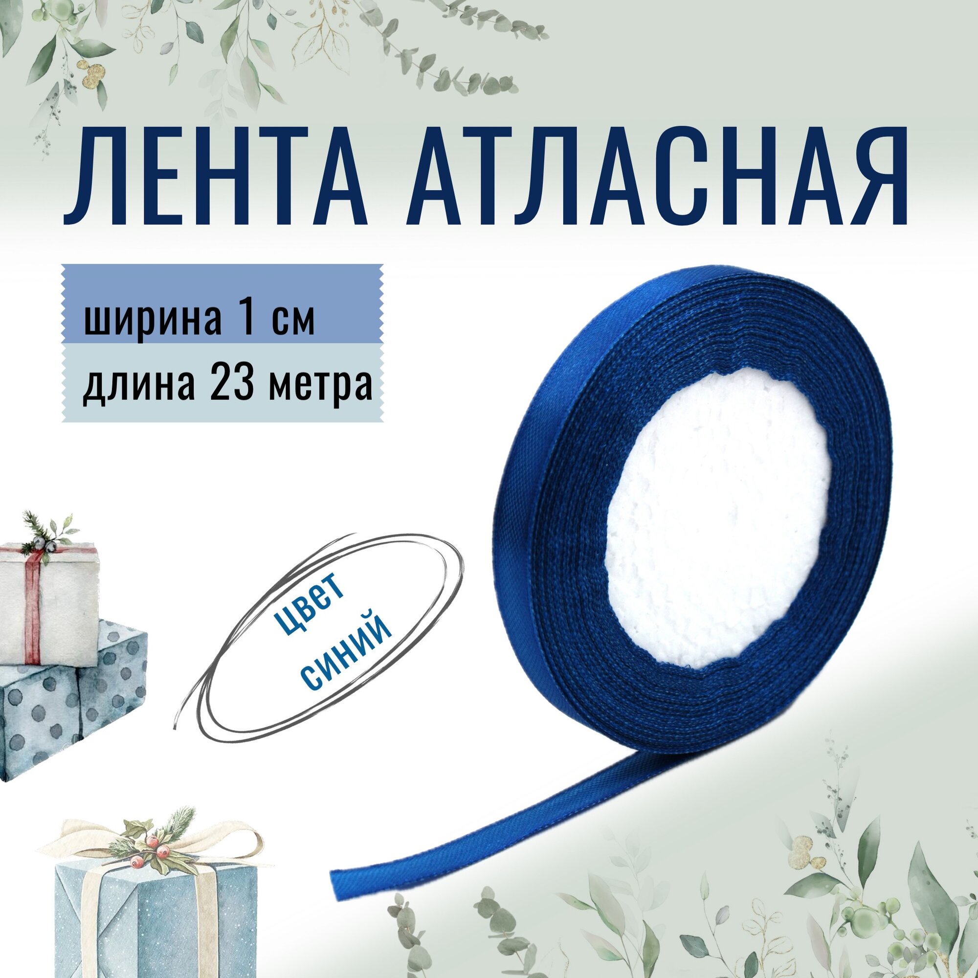 Лента атласная 1см х 23м синяя, упаковочная для рукоделия, для декора и творчества, шитья, упаковки и оформления подарков, 10мм