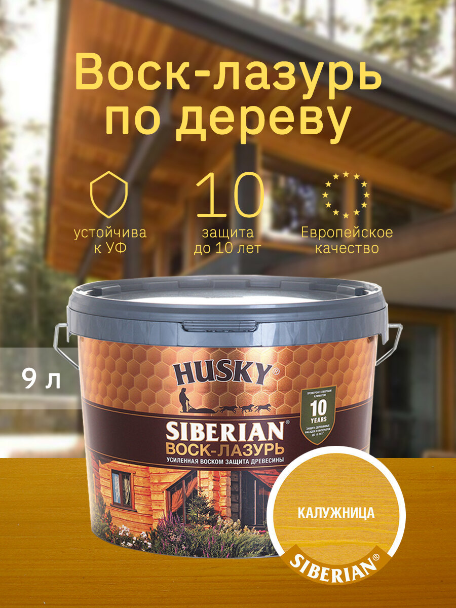 Хаски / Воск-лазурь для древесины, пропитка антисептик для дерева, декоративно-защитный состав HUSKY SIBERIAN калужница (9л)
