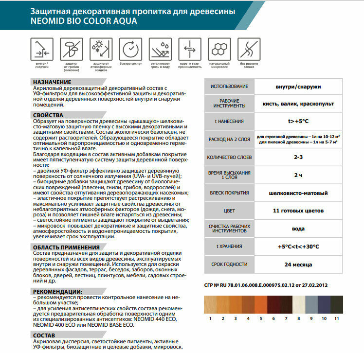| Особенности | УФ-защита, без запаха, быстросохнущая, водозащитная, декоративная, с антисептиком |